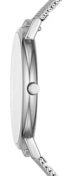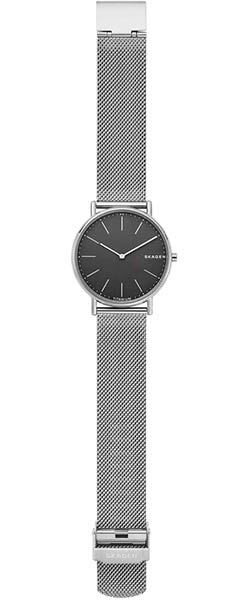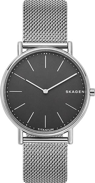Мужские кварцевые часы Signatur. Ультратонкие. Круглый титановый корпус. Метки в виде штрихов. Гладкая заводная головка. Браслет миланского плетения.
