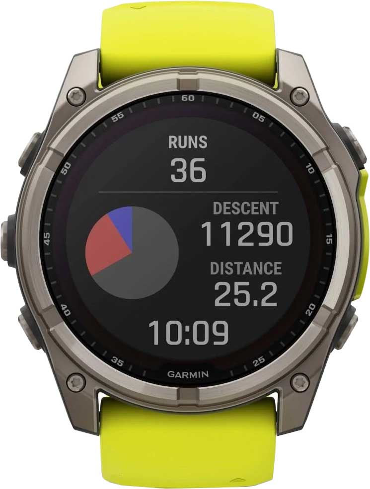 Fenix 8 Solar Sapphire Titan. Cмарт-часы для занятий спортом. Питание от солнечной энергии. Спутниковые системы навигации GPS, GLONASS, QZSS, BEIDOU и Galileo. Профили для занятий гольфом, плаванием, бегом, велоспортом, силовые тренировки, дайвинг и др. Отслеживание активности: шаги, калории, пульс, сон и др.