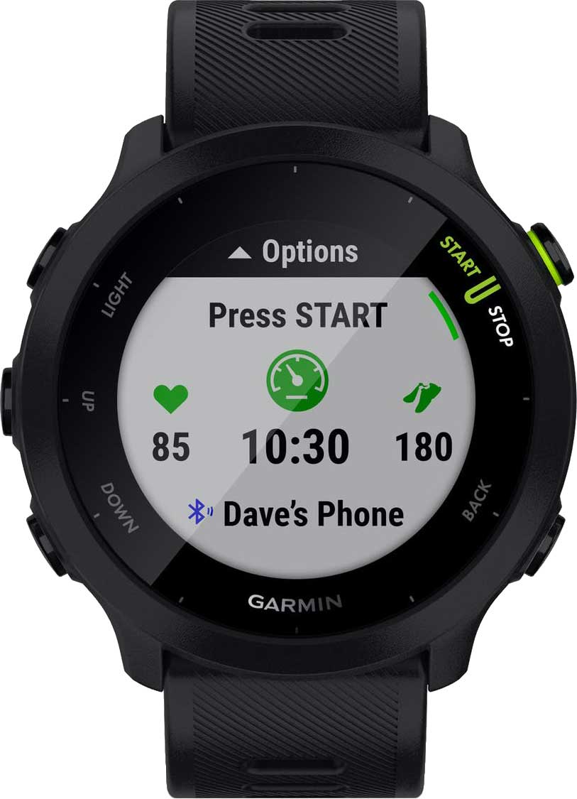 Смарт-часы Forerunner станет настоящим открытием для любителей активного образа жизни. Forerunner 55. Унисекс часы с мультиспортивными профилями. Приложение Garmin Connect, при подключении часов к смартфону поддерживает спортивные онлайн-сообщества Strava, TrainingPeaks, так же позволяет получать уведомления телефона на часах. Garmin Elevate - оптический датчик пульса на нижней стороне часов испускает свет в запястье пользователя с помощью светодиодов и измеряет количество света, которое рассеивается кровотоком. Отслеживание активности: шаги, калории, пульс и сон. Спутниковые системы навигации GPS, GLONASS и Galileo. Цветной сенсорный циферблат 1,04‘’ (26,3 мм) разрешением 208x208. Дополнительные функции: секундомер, SPLIT-хронограф, таймер, будильник, время восхода/захода солнца, автоматический переход на зимнее и летнее время. Датчики: акселерометр. Синхронизация со смартфоном iPhone, Android, Windows через Bluetooth, ANT+™, Wi-Fi: загружаемые циферблаты, поля данных, виджеты и приложения, оповещения, календарь, погода, управление воспроизведение музыки, поиск телефона. Перезаряжаемый аккумулятор. Индикатор заряда аккумулятора. Время работы аккумулятора: в режиме времени 14 дней, в режиме GPS до 20ч. Ремешок с классической застежкой и системой быстрой замены. Подробные характеристики в инструкции. Индивидуальная упаковка.