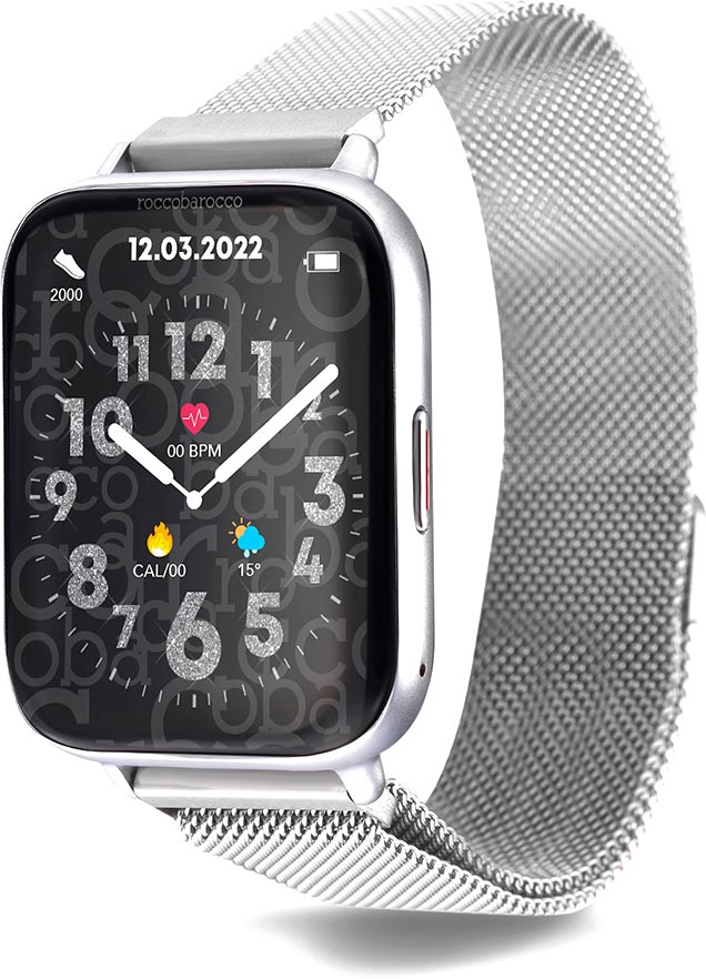 Смарт-часы с мультиспортивными режимом. Алюминиевый прямоугольный корпус. Отслеживание активности: шаги, калории, пульс, сон, ЧСС, измерение температуры тела, давление и уровень кислорода в крови. Дополнительные функции: секундомер, SPLIT-хронограф, будильник. Синхронизация со смартфоном через Bluetooth: виджеты и приложения, уведомления и оповещения, календарь, погода, управление камерой и воспроизведением музыки, поиск телефона. Перезаряжаемый аккумулятор. Индикатор заряда аккумулятора. Защищены по стандарту IP67. Изящный стальной браслет миланского плетения с магнитной застежкой.
