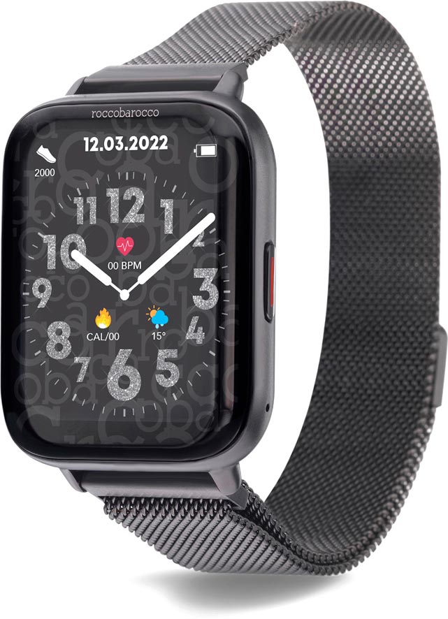 Смарт-часы с мультиспортивными режимом. Алюминиевый прямоугольный корпус. Отслеживание активности: шаги, калории, пульс, сон, ЧСС, измерение температуры тела, давление и уровень кислорода в крови. Дополнительные функции: секундомер, SPLIT-хронограф, будильник. Синхронизация со смартфоном через Bluetooth: виджеты и приложения, уведомления и оповещения, календарь, погода, управление камерой и воспроизведением музыки, поиск телефона. Перезаряжаемый аккумулятор. Индикатор заряда аккумулятора. Защищены по стандарту IP67. Изящный стальной браслет миланского плетения с магнитной застежкой.