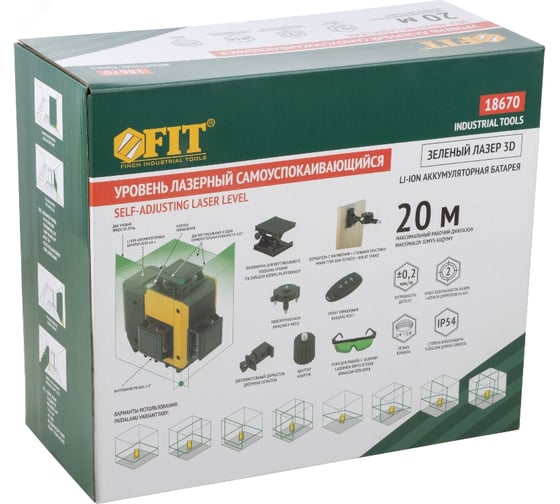 Уровень лазерный самоуспокаивающийся аккумуляторный FIT Li-Ion, мультипризменный 3х360, зеленый луч, диапазон 20 м, кейс 18670