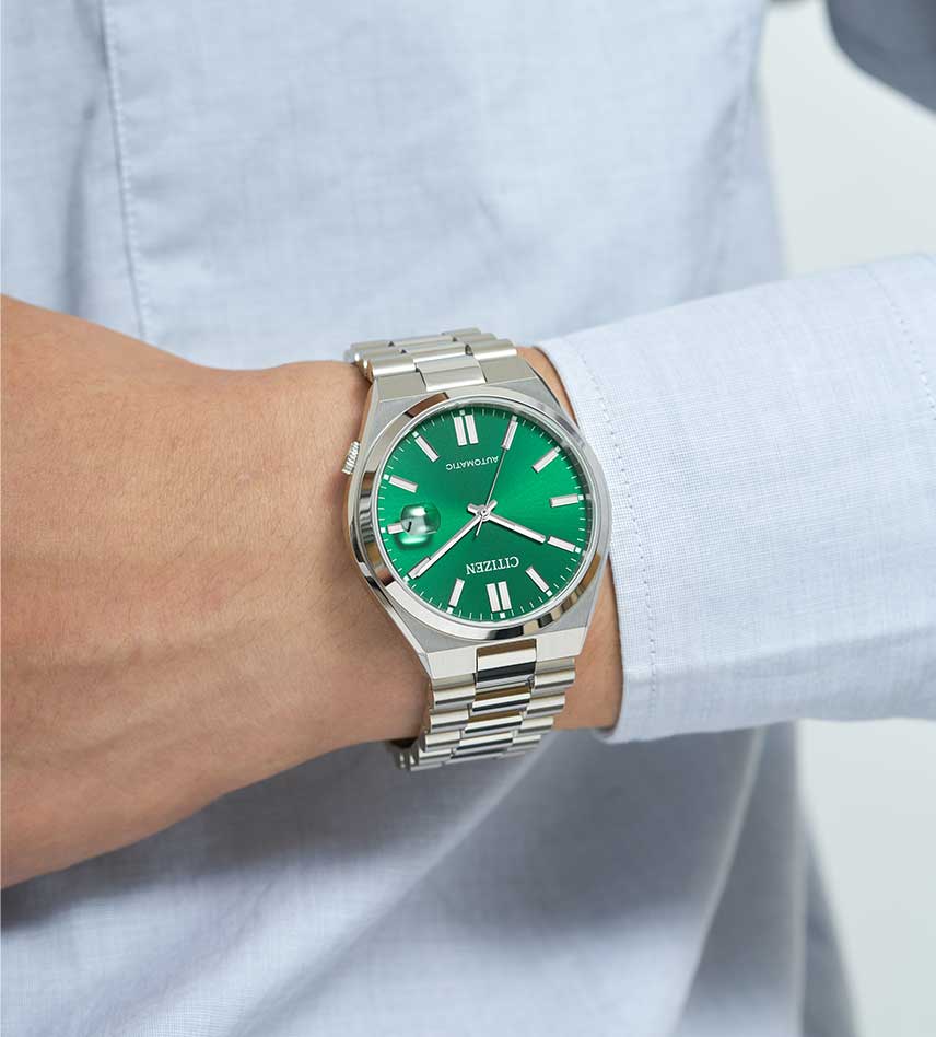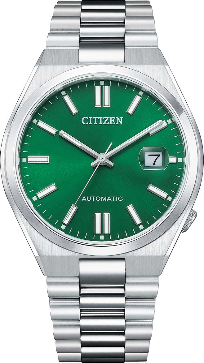Коллекция Citizen Automatic представляет собой идеальное сочетание классического и современного дизайна, которое понравится как людям, придерживающимся стиля модерн, так и ценителям изысканных часов. Tsuyosa. В механизме 21 камень, частота 21600 полуколебаний в час. Запас хода 42 часа. Циферблат с метками в виде штрихов выполнен по технологии Sunray (солнечные лучи). Окошко даты с увеличительным стеклом находится в положении 3 часа. Рифленая заводная головка находится в положении 4 часа. Завинчивающаяся прозрачная задняя крышка. Браслет с раскладывающейся застежкой.