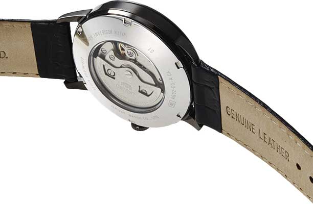 Циферблат с метками в виде штрихов. Завинчивающаяся прозрачная задняя крышка. Ремешок с классической застежкой.