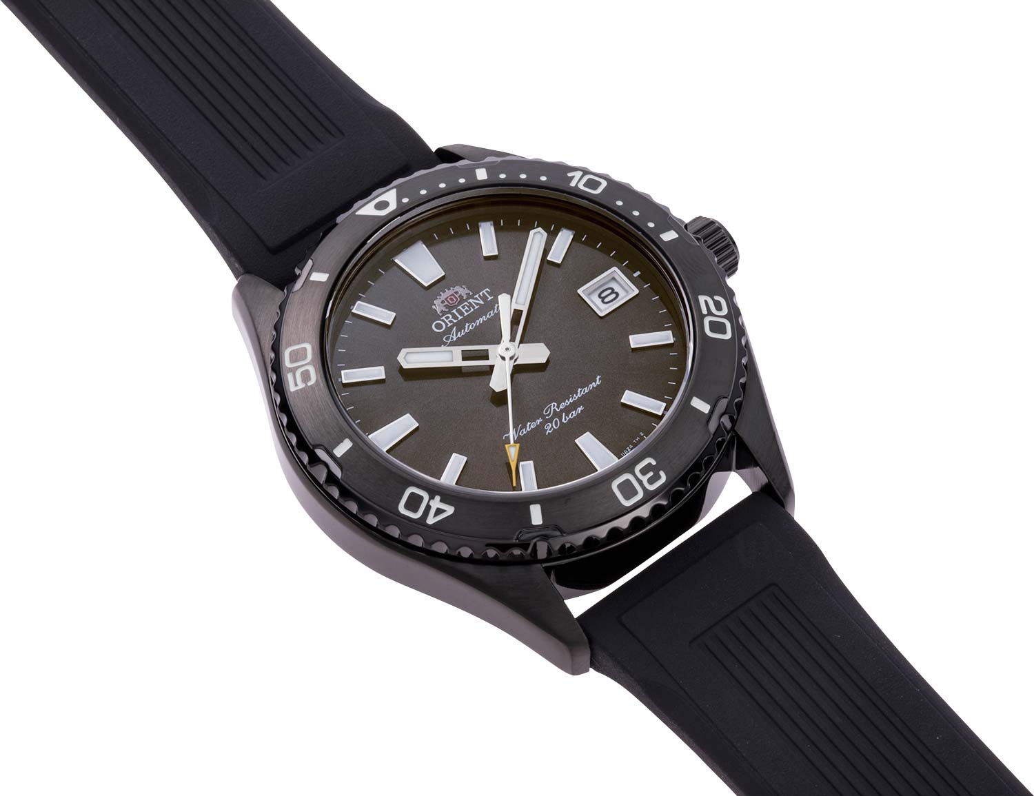 Метки в виде штрихов. Безель вращается на 120 щелчков в одном направлении. Окошко даты находится в положении 3 часа. Завинчивающиеся заводная головка и задняя крышка. Силиконовый ремешок с классической застежкой.