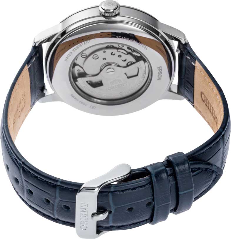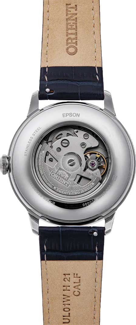 Окошко даты находится в положении 3 часа. День недели и индикатор день/ночь вынесены на отдельные циферблаты. Рифленая заводная головка. Прозрачная задняя крышка. Ремешок с классической застежкой и системой быстрой замены.