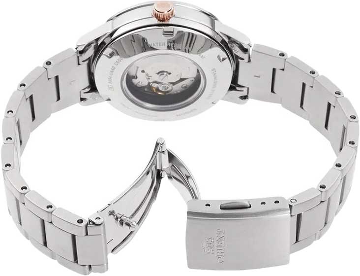 Точные и стильные часы от японского бренда Orient - совершенство в каждой детали. Contemporary. Женские часы с круглым стальным корпусом. В механизме 21 камень, частота 21600 полуколебаний в час. Запас хода 40 часов. Возможность ручного завода. Метки в виде штрихов. Рифленая заводная головка. Прозрачная завинчивающаяся задняя крышка. Браслет с раскладывающейся застежкой.