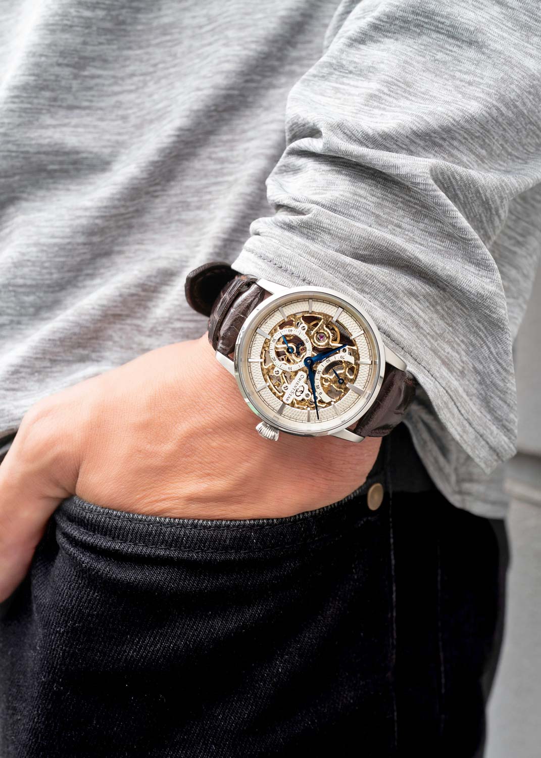 M45 Classic Full Skeleton. Мужские скелетонизированные часы с круглым стальным корпусом. В механизме 22 камня, частота 21600 полуколебаний в час. Ретроградный указатель запаса хода до 70 часов. Функция stop-second. Возможность ручного завода. Секундная стрелка вынесена на отдельный циферблат. Циферблат с метками в виде штрихов. Рифленая заводная головка. Завинчивающаяся прозрачная задняя крышка с сапфировым стеклом. Кожаный ремешок с раскладывающейся застежкой.