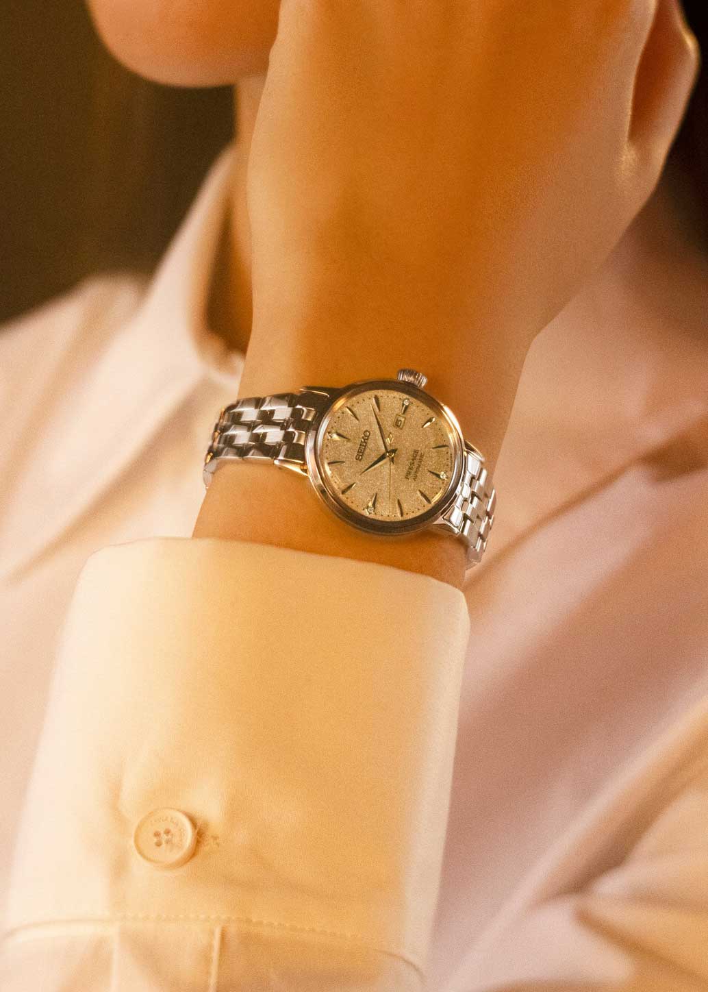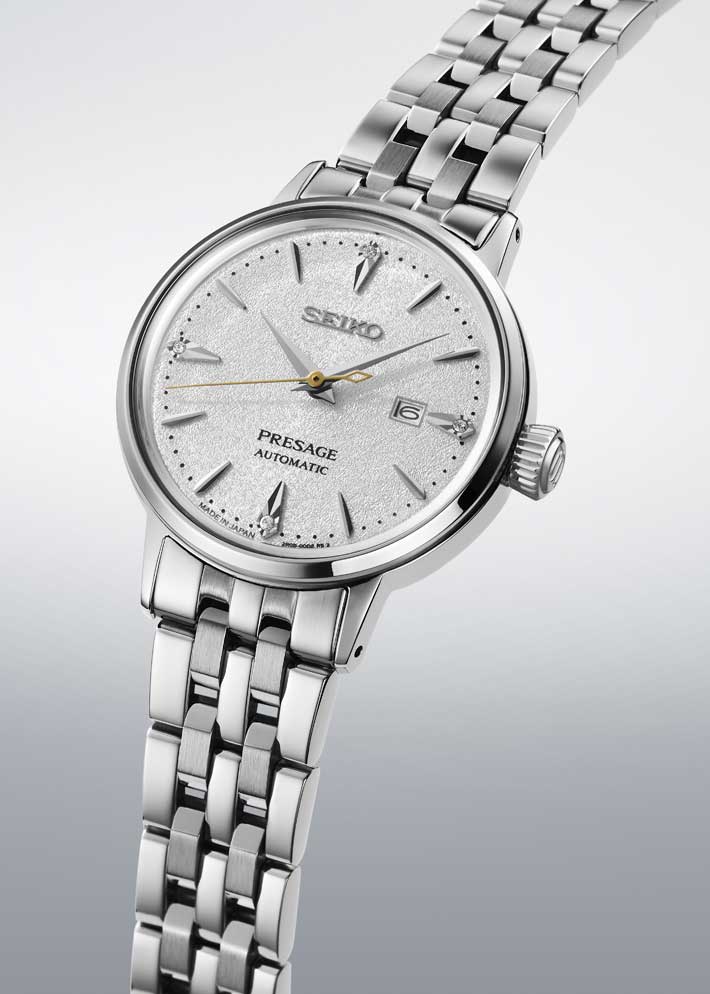 Presage Cocktail Time. Женские часы. Модель вдохновлена японской культурой коктейлей и другими особыми напитками из бара Star. В этом баре работает знаменитый бармен Хисаши Киши, который специализируется на смешивании японских и международных вкусов. Цветовая гамма часов вдохновлена коктейлем Hot Buttered Rum. Секундная стрелка выполнена в виде палочки для перемешивания коктейлей.