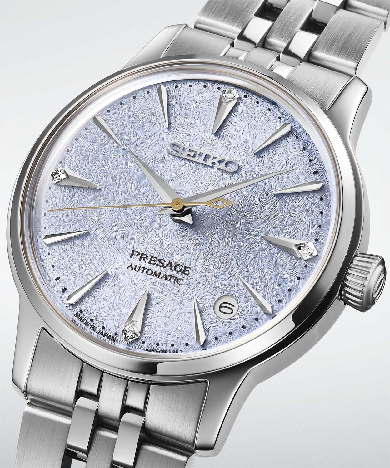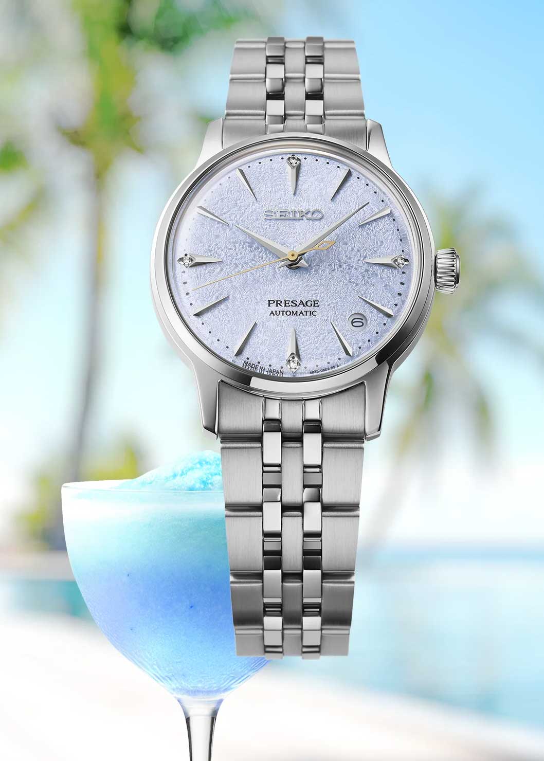 Presage Cocktail Time. Женские часы. Модель вдохновлена японской культурой коктейлей и другими особыми напитками из бара Star. В этом баре работает знаменитый бармен Хисаши Киши, который специализируется на смешивании японских и международных вкусов. Цветовая гамма часов вдохновлена коктейлем Frozen Skydiving. Секундная стрелка выполнена в виде палочки для перемешивания коктейлей.