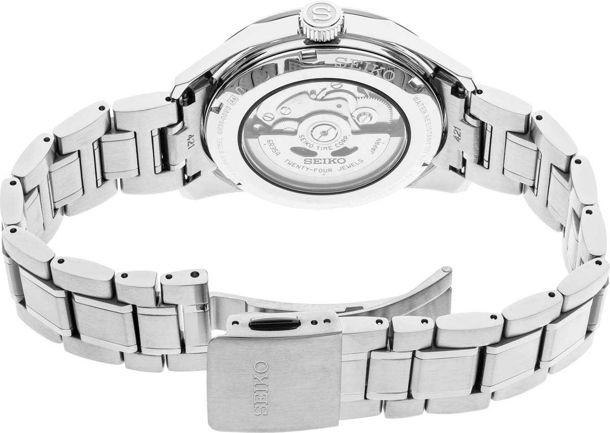 В механизме 24 камня, частота 21600 полуколебаний в час. Запас хода до 70 часов. Функция stop-second. Возможность ручного завода. Циферблат с метками в виде штрихов выполнен по технологии Sunray (солнечные лучи). Окошко даты находится в положении 3 часа. Завинчивающаяся прозрачная задняя крышка. Браслет с тройной раскладывающейся застежкой.