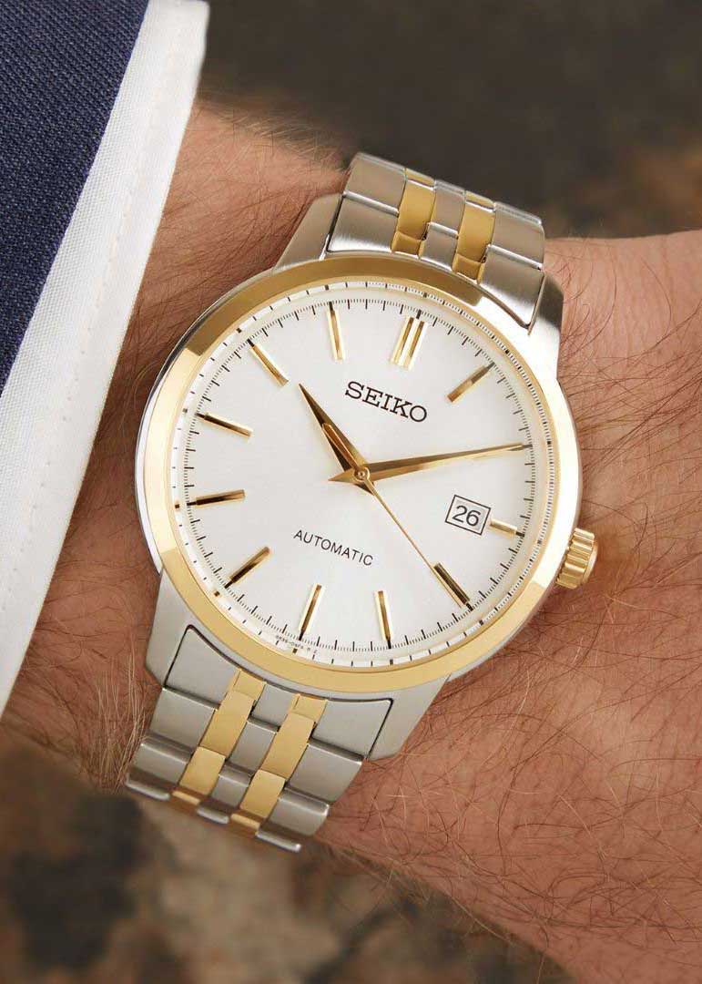 Циферблат с метками в виде штрихов выполнен по технологии Sunray (солнечные лучи). Окошко даты находится в положении 3 часа. Завинчивающаяся прозрачная задняя крышка. Браслет с тройной раскладывающейся застежкой.