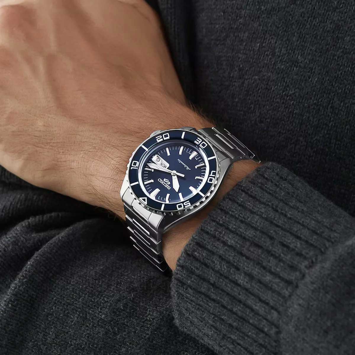 Надежные часы из коллекции 5 Sports в оригинальном корпусе из нержавеющей стали для уверенных в себе мужчин. 5 Sports SKX. Мужские наручные часы дизайн которых вдохновлен популярной серией Seiko 5 Sports SNZH. В механизме 24 камня, частота 21600 полуколебаний в час. Запас хода 41 час. Функция stop-second. Возможность ручного завода. Защищены от магнитных полей (до 4800 А/м). Циферблат с метками в виде штрихов выполнен по технологии Sunray (солнечные лучи). Стрелки и метки с фирменным люминесцентным покрытием LumiBrite, которое светится в темноте после непродолжительной подзарядки на свету. Двойное окошко даты и дня недели находится в положении 3 часа. Безель вращается в одном направлении. Рифленая заводная головка с защитой находится в положении 4 часа. Завинчивающаяся прозрачная задняя крышка. Надежный стальной браслет с раскладывающейся застежкой. Застежка с системой блокировки.
