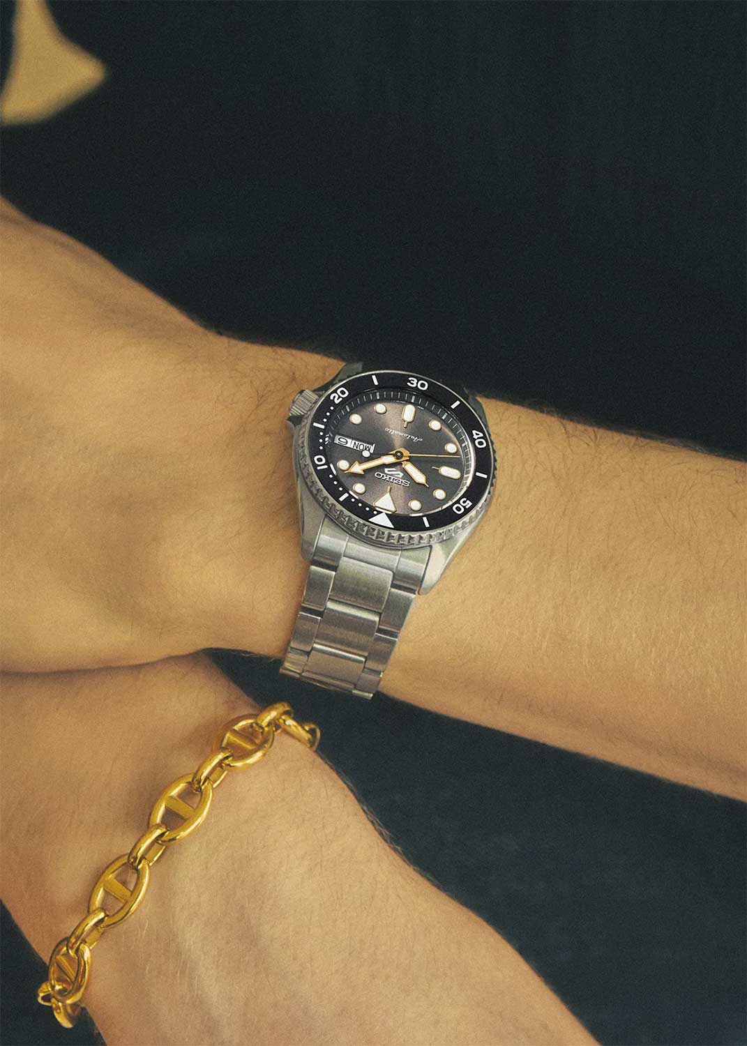 5 Sports SKX. Мужские часы. В механизме 24 камня, частота 21600 полуколебаний в час. Запас хода 41 час. Функция stop-second. Возможность ручного завода. Защищены от магнитных полей (до 4800 А/м).