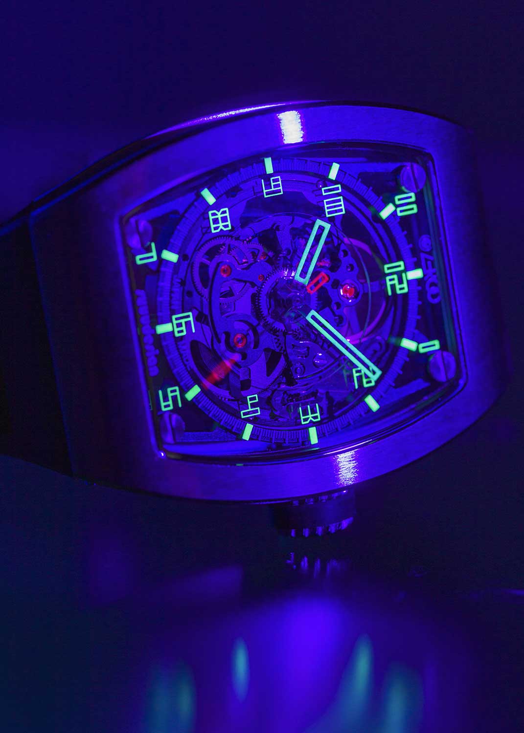 M2 The Subaru Skeleton. Лимитированная серия — 2999 экземпляров. Скелетонизированные часы. В механизме 26 камней, частота 28800 полуколебаний в час. Запас хода 40 часов. Стальной корпус бочкообразной формы.
