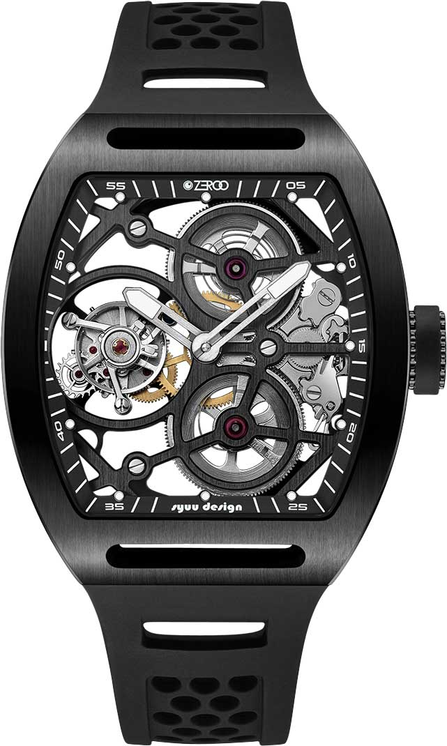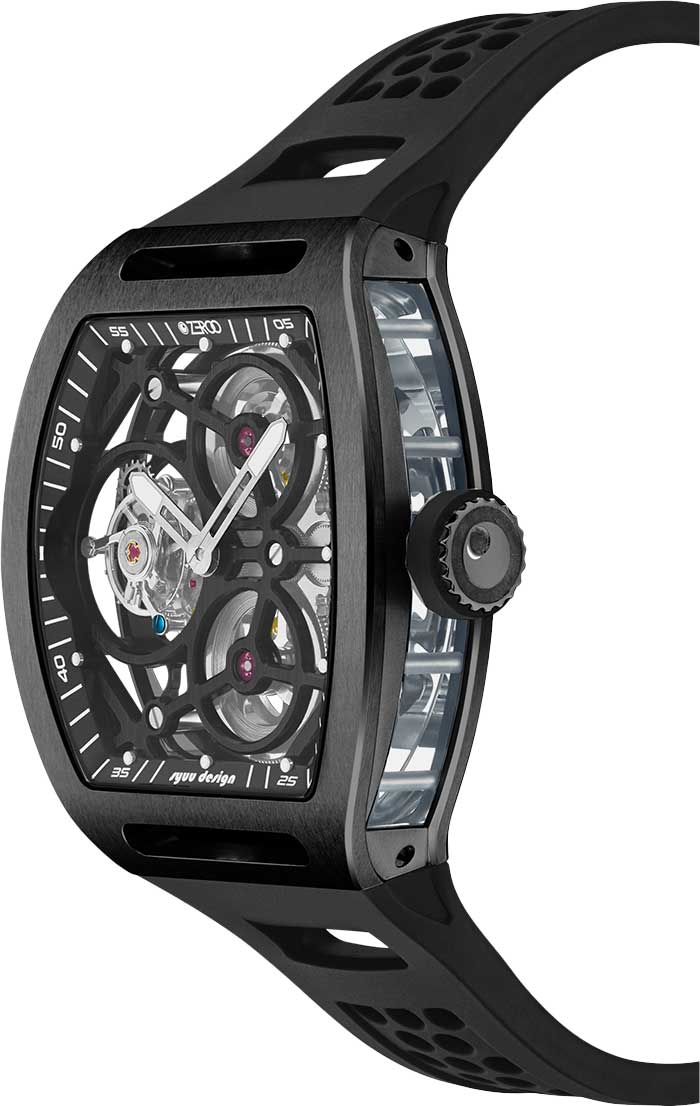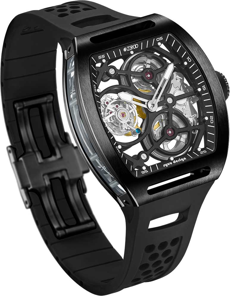 T4-01 The Archer Full Skeleton Tourbillon. Лимитированная серия — 1000 экземпляров. Скелетонизированные часы с турбийоном. Механизм с частотой 28800 полуколебаний в час. Запас хода 60 часов. Бочкообразный стальной корпус украшен прозрачными стеклянными вставками.
