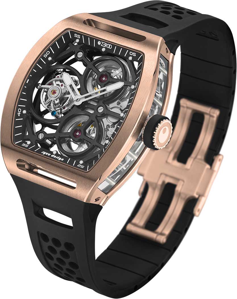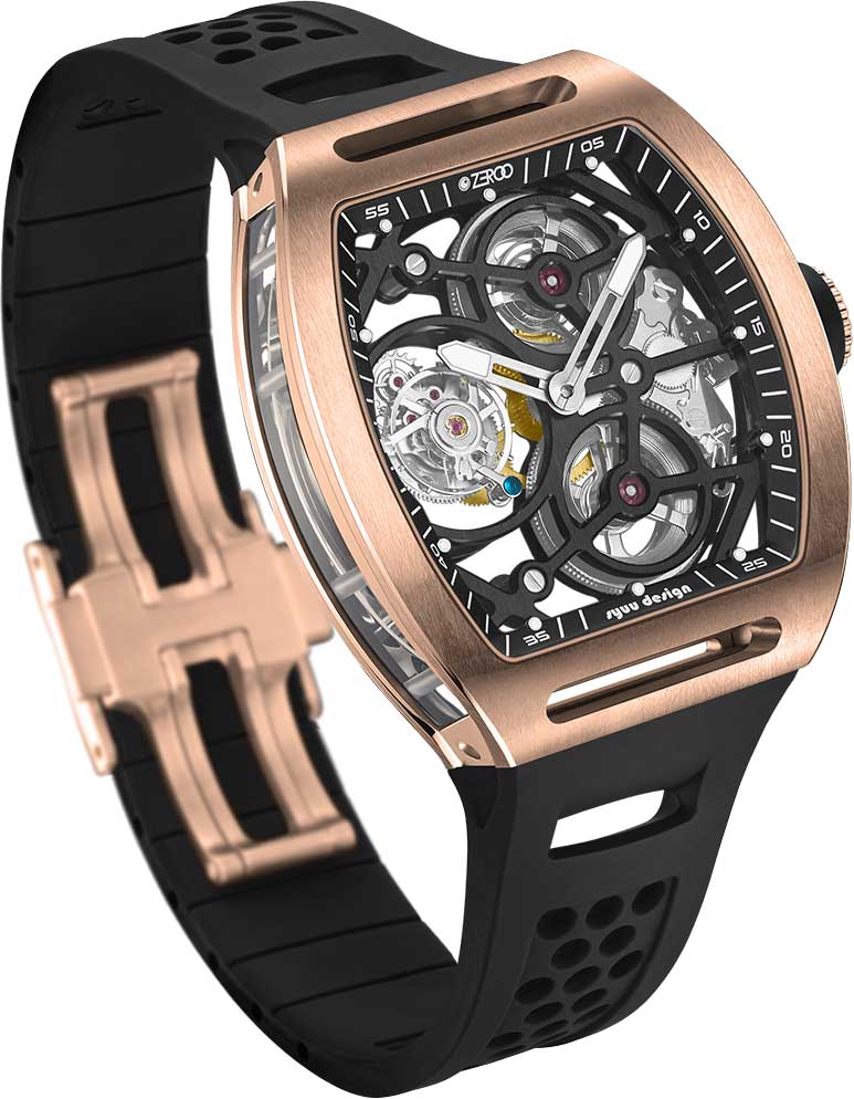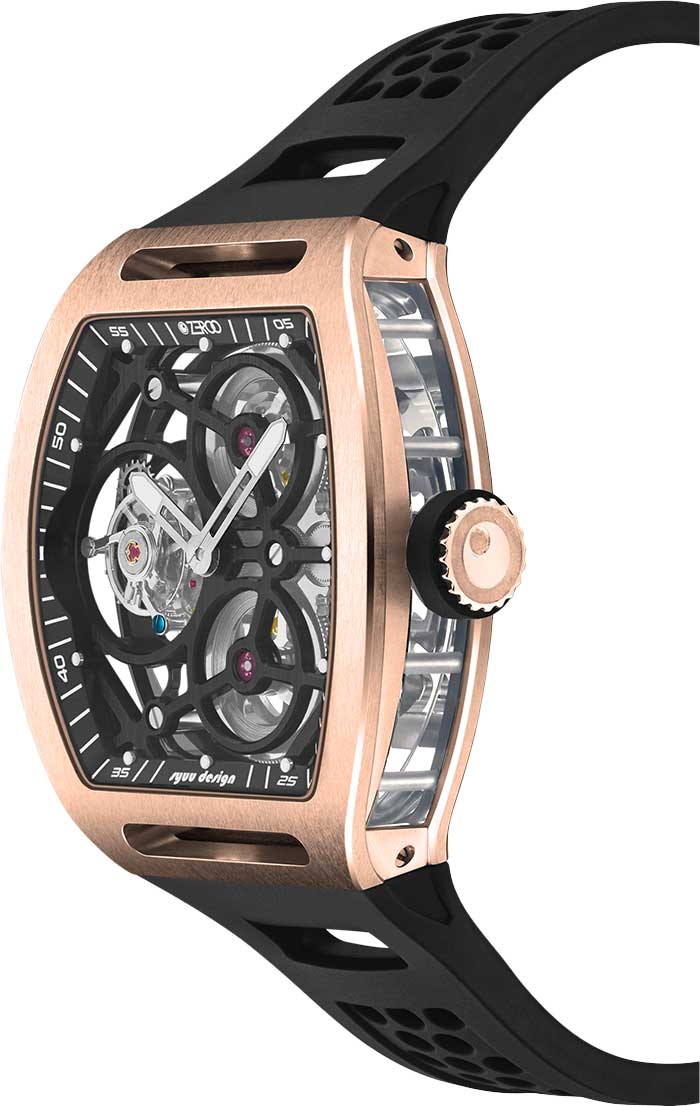 T4-01 The Archer Full Skeleton Tourbillon. Лимитированная серия — 1000 экземпляров. Скелетонизированные часы с турбийоном. Механизм с частотой 28800 полуколебаний в час. Запас хода 60 часов. Бочкообразный стальной корпус украшен прозрачными стеклянными вставками.