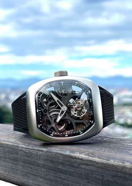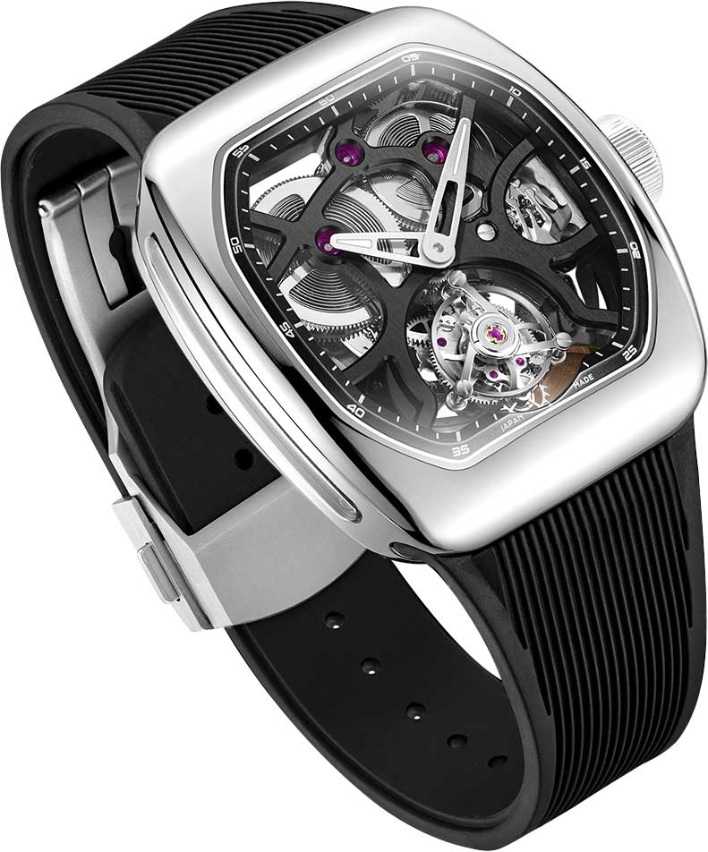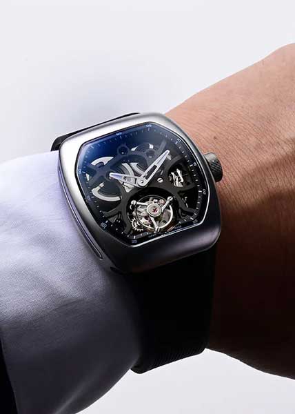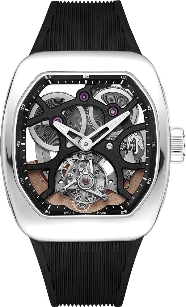T9-01 UFO Full Skeleton Automatic Tourbillon. Скелетонизированные часы с турбийоном. В механизме 35 камней, частота 28800 полуколебаний в час. Запас хода 60 часов. Стальной корпус украшен прозрачными вставками.