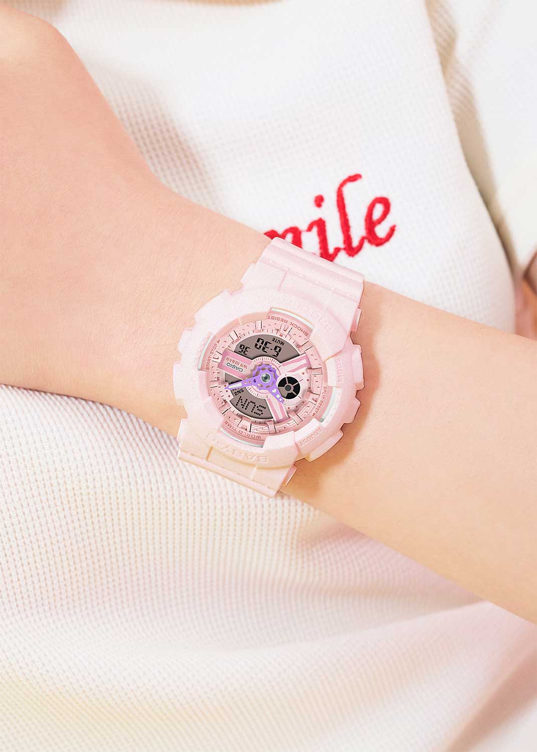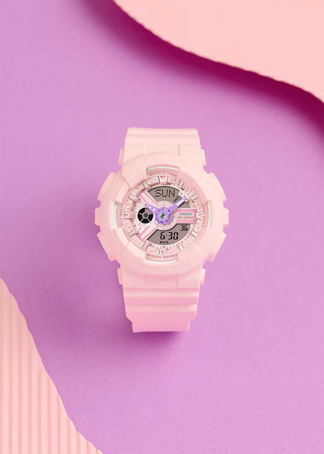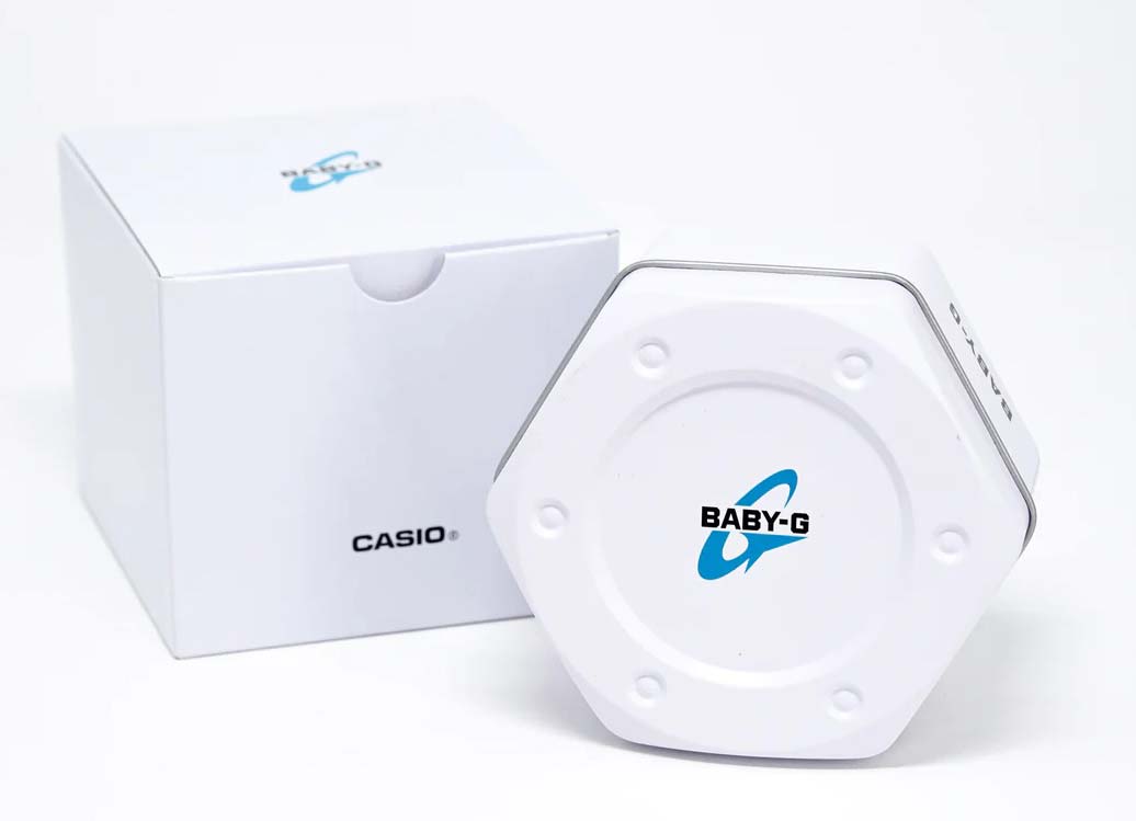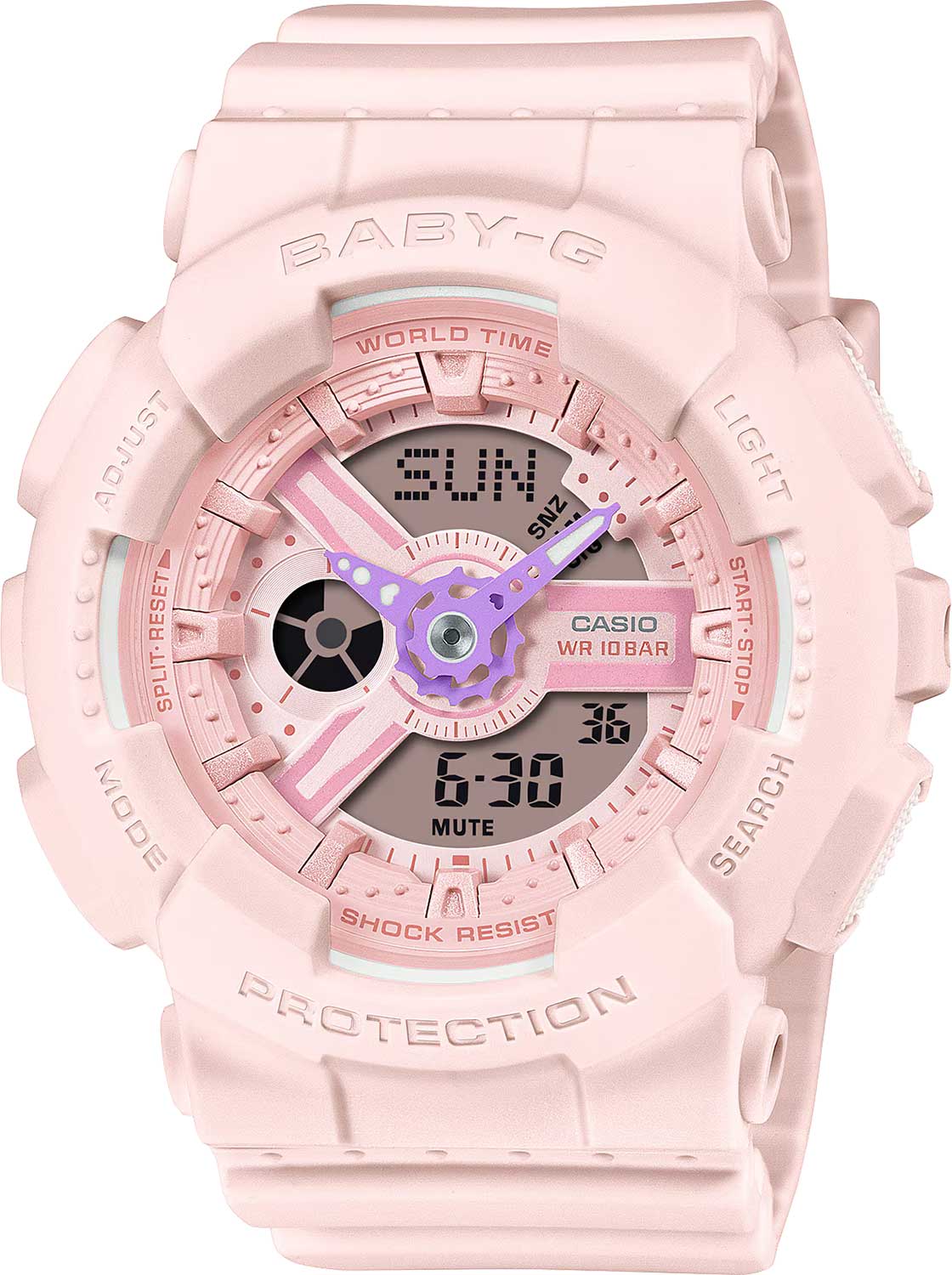 Baby-G. Женские часы. Противоударный корпус защищает механизм от ударов и вибрации. Циферблат подсвечивается светодиодом. В часах есть функция послесвечения - подсветка продолжает работать несколько секунд после того как кнопка подсветки была отпущена. Цвет подсветки: оранжевый. Необритовое светонакопительное покрытие обеспечивает длительное послесвечение в темноте даже после кратковременного нахождения на свету.