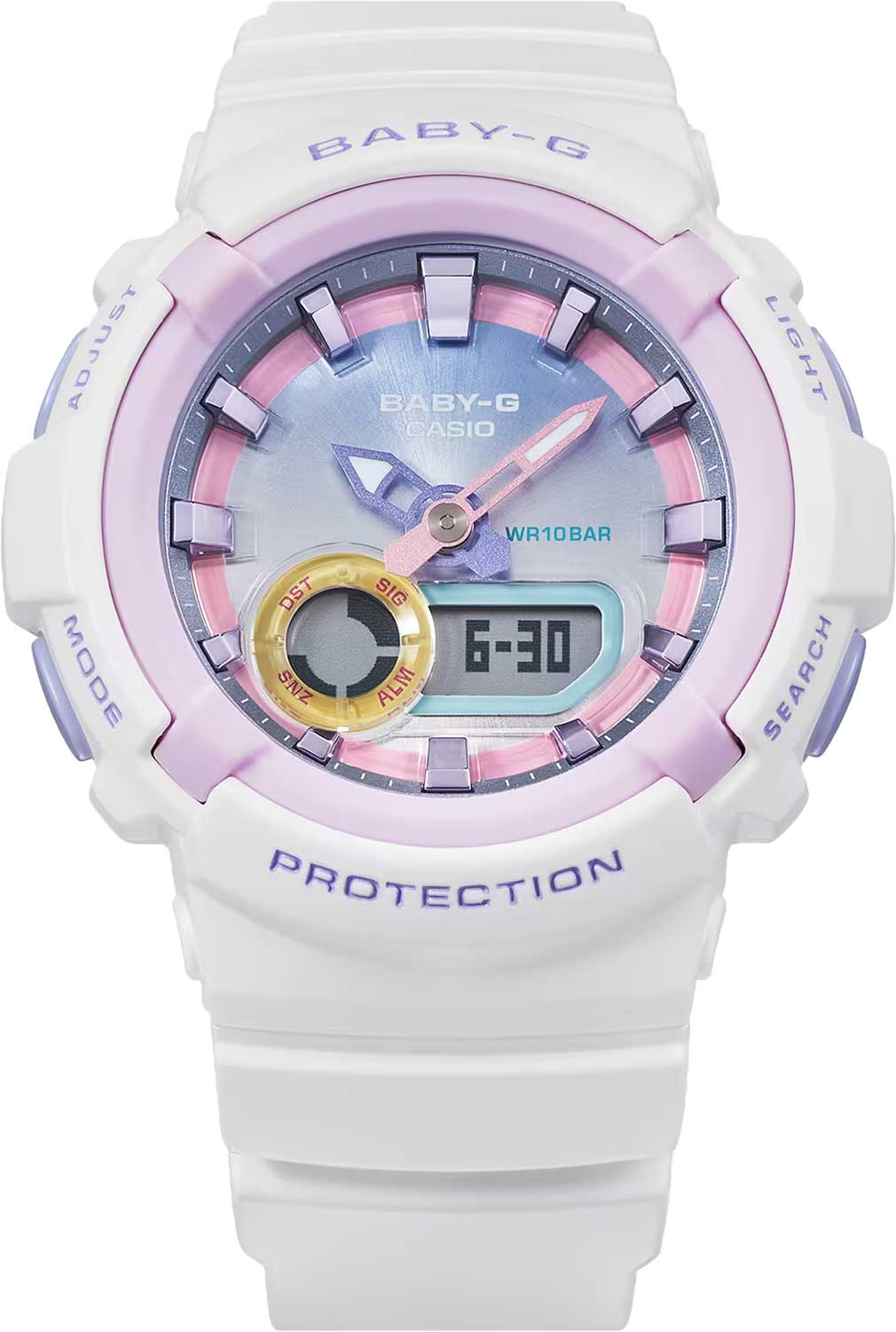 Надежные часики от Casio станут тем аксессуаром, с которым вы не расстанетесь ни на минуту.Baby-G. Женские часы выполненные в нежных пастельных тонах. Противоударный корпус защищает механизм от ударов и вибрации. Циферблат подсвечивается ярким светодиодом. Настраиваемое послесвечение 1,5 или 3сек. Цвет подсветки: белый. Необритовое светонакопительное покрытие обеспечивает длительное послесвечение в темноте даже после кратковременного нахождения на свету. 12-ти и 24-х часовой формат времени. Секундомер с точностью показаний 1с и временем измерения 1ч. SPLIT-хронограф.Таймер обратного отсчета от 1мин до 1ч с автоповтором. Мировое время – 27 городов (29 часовых поясов), всемирное координированное время (UTC).