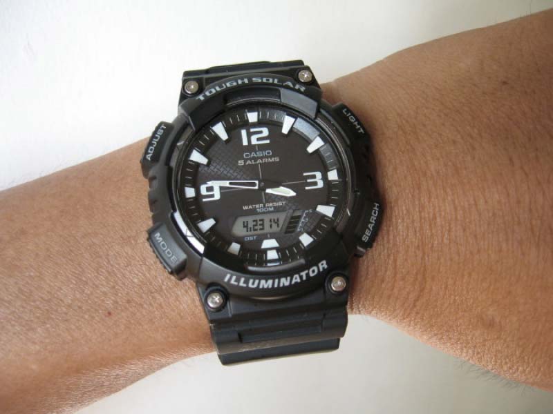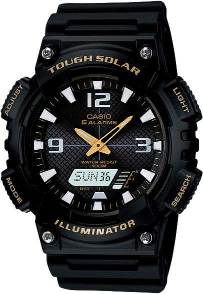 Многофункциональные и сдержанные часы в спортивном стиле станут идеальным выбором для современных мужчин. Analog-Digital Combination. LCD циферблат подсвечивается светодиодом. Светонакопительное покрытие необрит продолжает светиться в темноте даже после непродолжительного пребывания на свету. Питание от солнечной энергии, индикатор заряда батареи. Функция автоматического сохранения энергии (отключает LCD дисплей). Время работы аккумулятора без подзарядки - 10 месяцев, при включенной функции сохранения энергии - 23 месяцев. Секундомер с точностью показаний 1/100с и временем измерения 1ч. Два таймер обратного отсчета времени от 5с до 100мин с устанавливаемым количеством повторов от 1 до 10. Мировое время. 12-ти и 24-х часовой формат времени. Шесть языков отображения дня недели: английский, португальский, испанский, французский, немецкий и итальянский. Функция включения/отключения звука.