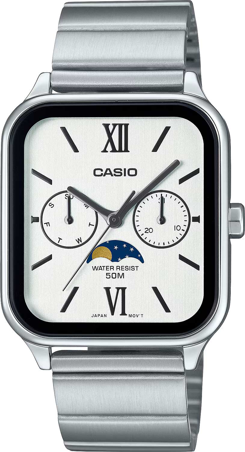 Стильные часы от Casio несомненно найдут поклонников среди ценителей надежных и практичных аксессуаров. Standard. Мужские часы. Циферблат с метками в виде штрихов и двух римских цифр. Число и день недели вынесены на отдельные циферблаты. Отображение фаз Луны. Батарейка рассчитана на 3 года. Браслет с тройной раскладывающейся застежкой, расстегиваемой одним касанием.