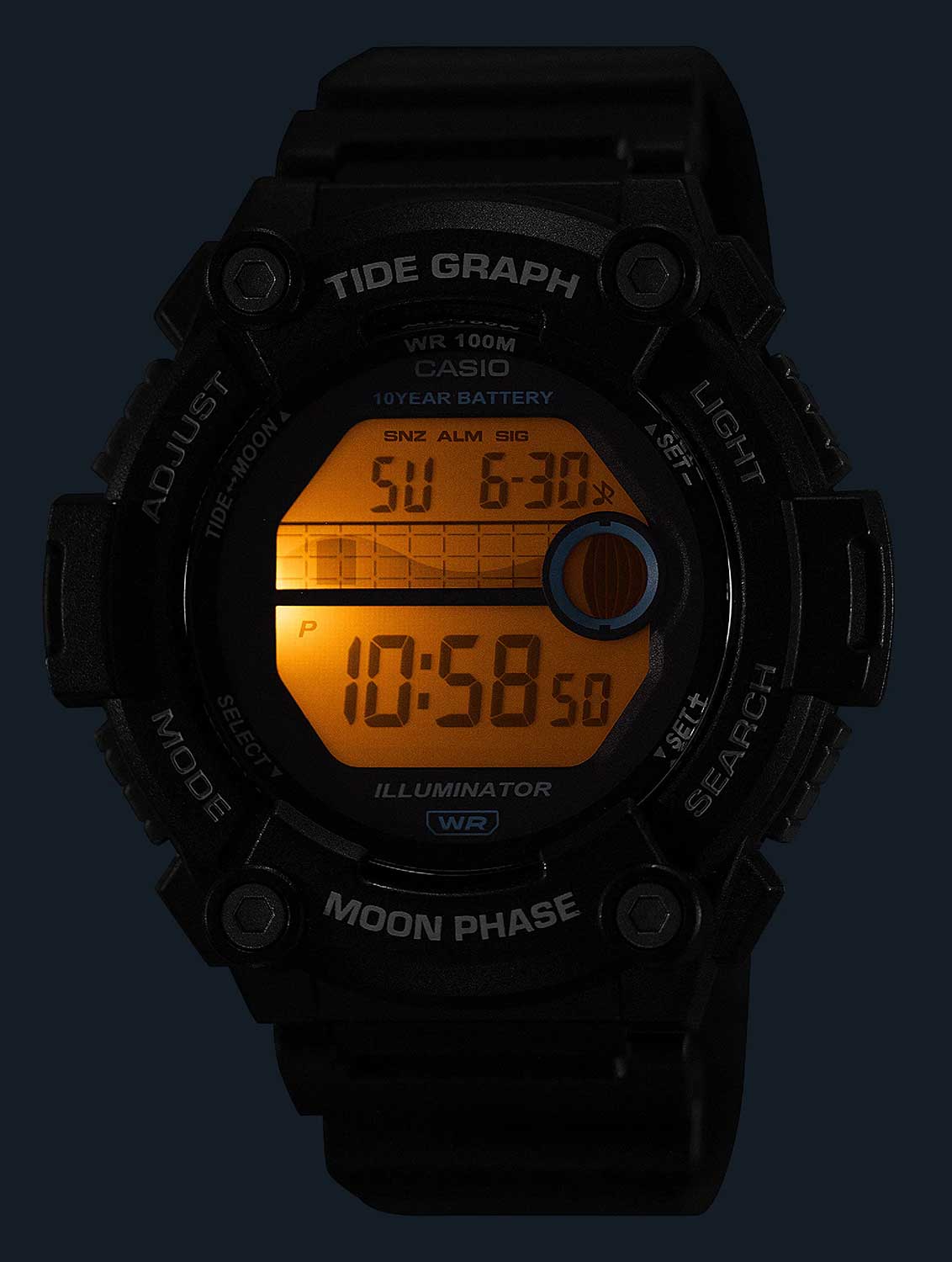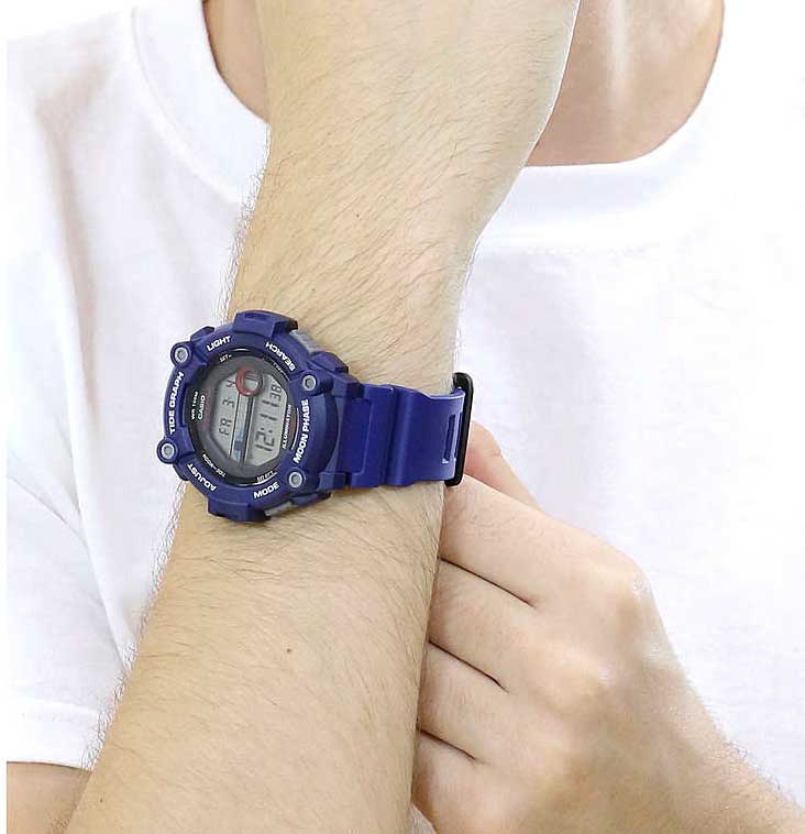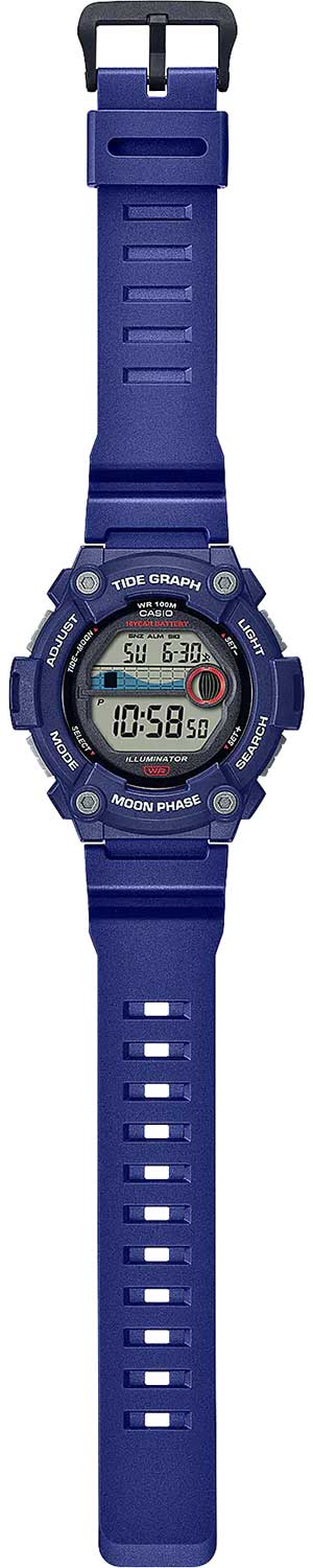 Эти часы станут отличным подарком для любителя морских приключений, они всегда подскажут время прилива. Collection. Циферблат подсвечивается светодиодом. Настраиваемое послесвечение 1,5 или 3сек. Цвет подсветки: оранжевый. Второй часовой пояс. Отображение возраста Луны на конкретную дату и графика фаз Луны. 12-ти и 24-х часовой формат времени. Секундомер с точностью показаний 1/100с и временем измерения 24ч. SPLIT-хронограф. Таймер обратного отсчета от 1мин до 24ч с автоповтором. График приливов и отливов. Функция включения/отключения звука. Типы сигналов: ежедневный, ежемесячный, каждый день определенного месяца, на определенную дату. Батарея рассчитана на 10 лет. Водонепроницаемость 10 Бар в соответствии с ISO 2281. Стальная задняя крышка крепится на 4-х винтах. Ремешок из полимерного материала с классической застежкой.