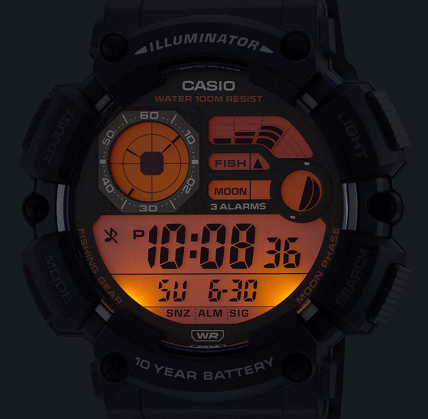 Если вы заядлый рыбак, то эти часы для вас станут настоящим открытием, которое просто незаменимо на рыбалке. Standard. Мужские часы. Циферблат подсвечивается светодиодом. Настраиваемое послесвечение 1,5 или 3сек. Цвет подсветки: оранжевый. Индикатор рыбалки - определяет время, наиболее подходящего для рыбалки. На экране отображаются символы в виде одного из четырех уровней в зависимости от времени идеально подходящего для рыбалки. Отображение возраста Луны на конкретную дату и графика фаз Луны. Второй часовой пояс. 12-ти и 24-х часовой формат времени. Секундомер с точностью показаний 1/100с и временем измерения 24ч. SPLIT-хронограф. Таймер обратного отсчета от 1мин до 24ч с автоповтором. Функции включения/отключения звука и включения/отключения летнего времени. Типы сигналов будильника: ежедневный, ежемесячный, каждый день определенного месяца, на определенную дату. Батарея рассчитана на 10 лет. Водонепроницаемость 10 Бар в соответствии с ISO 2281. Стальная задняя крышка крепится на 4-х винтах. Ремешок из полимерного материала.