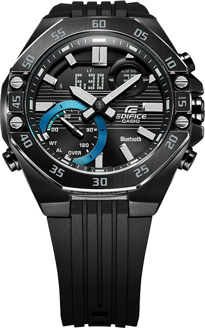Многофункциональный аксессуар который станет настоящим помощником для настоящего мужчины. Edifice. Новинка в серии Edifice ECB. Циферблат подсвечивается ярким светодиодом. Цвет подсветки: белый. Необритовое светонакопительное покрытие обеспечивает длительное послесвечение в темноте даже после кратковременного нахождения на свету. Мировое время – 38 городов (38 часовых поясов). Функция включения/отключения летнего времени. Секундомер с двумя точностями показаний: 1/1000с (до 1ч) и 1/10с (после 1ч) и временем измерения 24ч. SPLIT-хронограф. Таймер обратного отсчета от 1с до 24ч. Таймер расписания синхронизируется с календарем в смартфоне и производит обратный отсчет до начала назначенного в календаре события. 12-ти и 24-х часовой формат времени. Беспроводная технология Bluetooth® 4.0 со сверхнизким потреблением энергии для синхронизации со смартфоном. При подключении к смартфону часы автоматически корректируют текущее время, в том числе переход на зимнее/летнее время, копируют настройки мирового времени более чем для 300 городов. Приложение EDIFICE Connected позволяет вести журнал показаний секундомера и прохождения этапов, вычислять разность между заданным временем и временем этапа. Отображение дней недели на разных языках. Авиарежим - часы переключаются в режим офлайн нажатием кнопки. Функции перемещения стрелок для беспрепятственного просмотра информации на цифровых дисплеях, отключения/включения звука и поиска телефона. Заводная головка с защитой. Ремешок из полимерного материала.