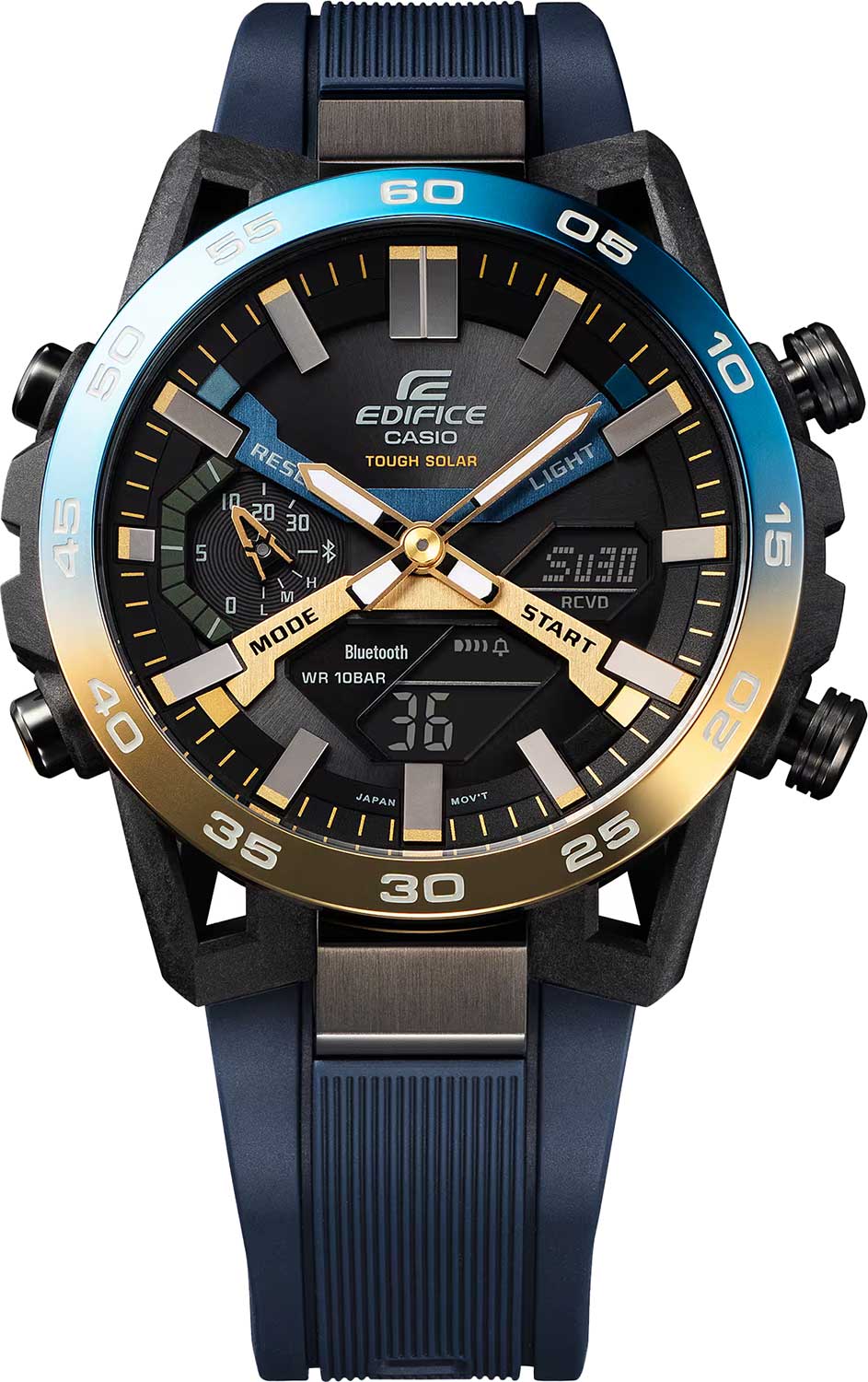 Многофункциональные часы, дизайн которых пропитан гонками и скоростью, без сомнения оценит любой мужчина. Edifice Sospensione. Мужские часы, дизайн которых вдохновлен подвеской болида Формулы-1. Ушки часов разработаны по схеме четырехрычажной подвески гоночного автомобиля. Цветовая гамма часов вдохновлена синевой ночного неба, которое пронзает свет уличных фонарей. Питание от солнечной энергии Tough Solar - солнечные батарейки большой мощности, индикатор заряда батареи. Функция автоматического сохранения энергии. Время работы аккумулятора без подзарядки приблизительно 7 месяцев, при включенной функции сохранения энергии приблизительно 18 месяцев. Двойная подcветка: циферблат и ЖК-дисплеи подсвечиваются светодиодом, благодаря наличию функции задержки, после отпускания кнопки освещение горит еще несколько секунд. Настраиваемое послесвечение 1,5 или 3сек. Цвет подсветки: белый. Необритовое светонакопительное покрытие обеспечивает длительное послесвечение в темноте даже после кратковременного нахождения на свету. 12-ти и 24-х часовой формат времени. Секундомер с двумя точностями показаний: 1/100с (до 1ч) и 1с (после 1ч) и временем измерения 24ч. SPLIT-хронограф. Таймер обратного отсчета от 1с до 24ч. Мировое время – 38 городов (38 часовых поясов), всемирное координированное время (UTC). Автоматический переход на зимнее и летнее время, возможность включения/отключения данной функции. Отображение кода и названия города. Переключение между домашним и мировым временем. Беспроводная технология Bluetooth® со сверхнизким потреблением энергии для синхронизации со смартфоном. При подключении к смартфону часы корректируют текущее время, настраивают будильник, а также копируют настройки мирового времени (300 городов). Отображение дней недели на шести языках. Функции перемещения стрелок, поиска телефона и включения/отключения звука. Водонепроницаемость 10 Бар в соответствии с ISO 2281. Ремешок с классической застежкой.
