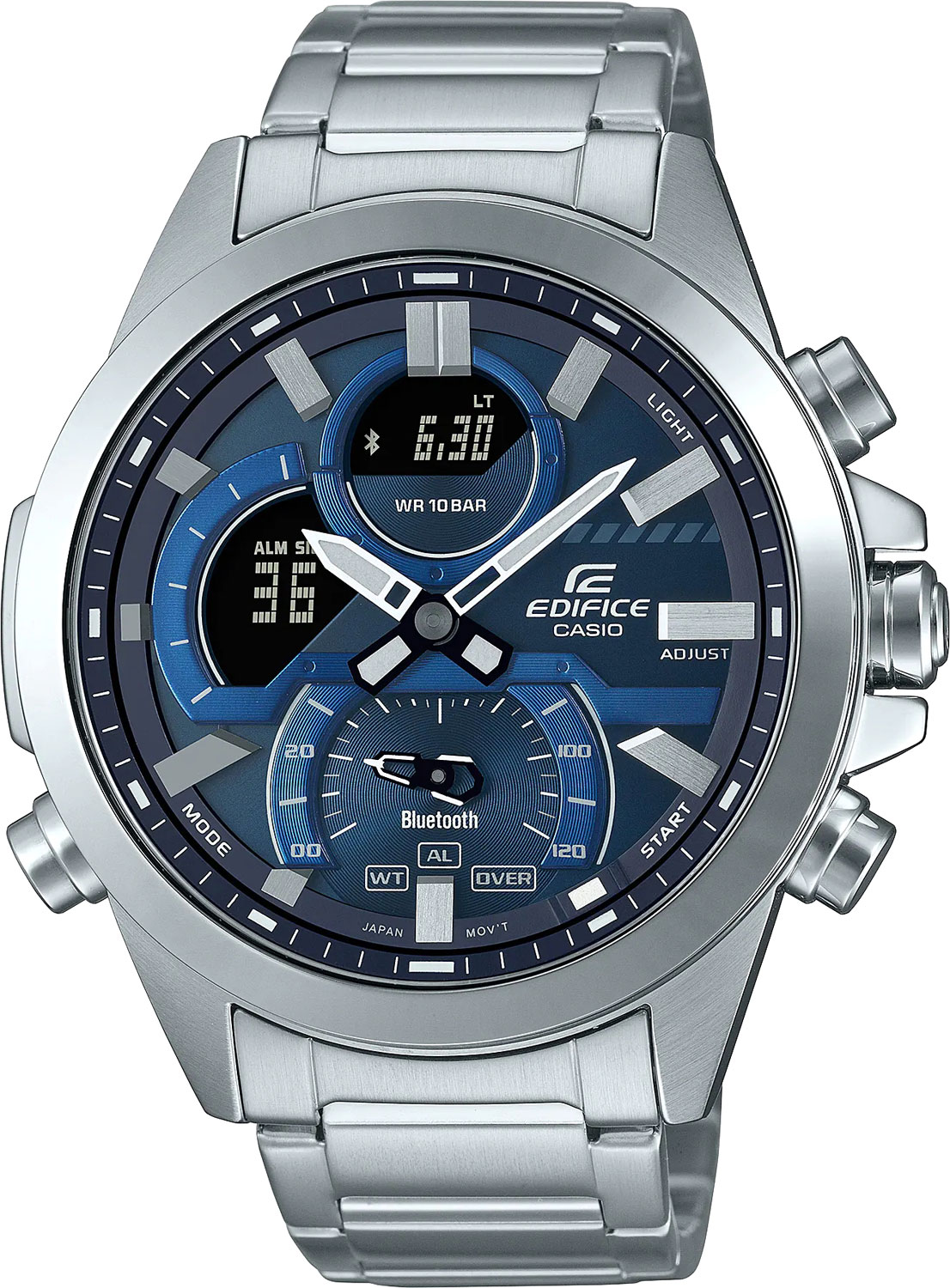 Добро пожаловать в эволюцию Speed & Intelligence - высокотехнологичная красота стального хронографа EDIFICE с брутальным видом и удобным подключением к смартфону. Эта модель позволяет легко синхронизироваться со смартфоном через Bluetooth® и подключаться к приложению Casio Watches для полной функциональности под сенсорным управлением. Приложение обеспечивает точный отсчет времени без нажатия кнопок, когда ваш телефон находится рядом. Таймер расписания, разработанный для удовлетворения потребностей гоночных команд, синхронизируется с приложением календаря вашего смартфона для передачи элементов расписания на телефон и отображения времени начала и окончания на ЖК-дисплее часов. Цифро-аналоговый циферблат с крупными метками, дополнительными циферблатами и элементом в форме моста выполнен в смелом дизайне. Часы оснащены светодиодной подсветкой, которая загорается при простом наклоне запястья. Вдохновленный спорткарами дизайн механического циферблата увеличивает глубину и объем, чтобы передать динамичный облик, силу и надежность этих высокопроизводительных автомобилей. Созданный в стиле спидометра дополнительный циферблат на 6 часов еще больше усиливает концепцию дизайна спортивного автомобиля. С новинкой Edifice вы получаете не просто аксессуар, а настоящий многофункциональный гаджет, который станет верным помощником для современного мужчины.Edifice. Двойная подсветка Super illuminator с функцией Afterglow (для подсветки не нужно удерживать кнопку, время послесвечения настраивается 1,5 или 3 сек): одновременно подсвечивается аналоговый циферблат и цифровой дисплей. При наклоне часов в сторону лица для считывания, функция автоподсветки обеспечивает автоматическое включение светодиодной подсветки. Цвет подсветки: белый. Светонакопительное покрытие Neobrite обеспечивает длительное послесвечение в темноте даже после кратковременного нахождения на свету. 12-ти и 24-х часовой формат времени. Секундомер с двумя точностями показаний: 1/1000с (до 1ч) и 1/10с (после 1ч) и временем измерения 24ч. SPLIT-хронограф. Память на 200 кругов. Таймер обратного отсчета от 1с до 24ч. Мировое время