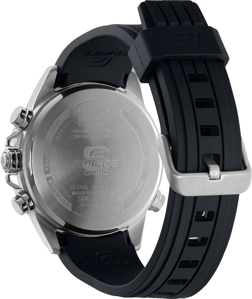 Добро пожаловать в эволюцию Speed & Intelligence - высокотехнологичная красота стального хронографа EDIFICE с брутальным видом и удобным подключением к смартфону. Эта модель позволяет легко синхронизироваться со смартфоном через Bluetooth® и подключаться к приложению Casio Watches для полной функциональности под сенсорным управлением. Приложение обеспечивает точный отсчет времени без нажатия кнопок, когда ваш телефон находится рядом. Таймер расписания, разработанный для удовлетворения потребностей гоночных команд, синхронизируется с приложением календаря вашего смартфона для передачи элементов расписания на телефон и отображения времени начала и окончания на ЖК-дисплее часов. Цифро-аналоговый циферблат с крупными метками, дополнительными циферблатами и элементом в форме моста выполнен в смелом дизайне. Часы оснащены светодиодной подсветкой, которая загорается при простом наклоне запястья. Вдохновленный спорткарами дизайн механического циферблата увеличивает глубину и объем, чтобы передать динамичный облик, силу и надежность этих высокопроизводительных автомобилей. Созданный в стиле спидометра дополнительный циферблат на 6 часов еще больше усиливает концепцию дизайна спортивного автомобиля. С новинкой Edifice вы получаете не просто аксессуар, а настоящий многофункциональный гаджет, который станет верным помощником для современного мужчины.Edifice. Двойная подсветка Super illuminator с функцией Afterglow (для подсветки не нужно удерживать кнопку, время послесвечения настраивается 1,5 или 3 сек): одновременно подсвечивается аналоговый циферблат и цифровой дисплей. При наклоне часов в сторону лица для считывания, функция автоподсветки обеспечивает автоматическое включение светодиодной подсветки. Цвет подсветки: белый. Светонакопительное покрытие Neobrite обеспечивает длительное послесвечение в темноте даже после кратковременного нахождения на свету. 12-ти и 24-х часовой формат времени. Секундомер с двумя точностями показаний: 1/1000с (до 1ч) и 1/10с (после 1ч) и временем измерения 24ч. SPLIT-хронограф. Память на 200 кругов. Таймер обратного отсчета от 1с до 24ч. Мировое время
