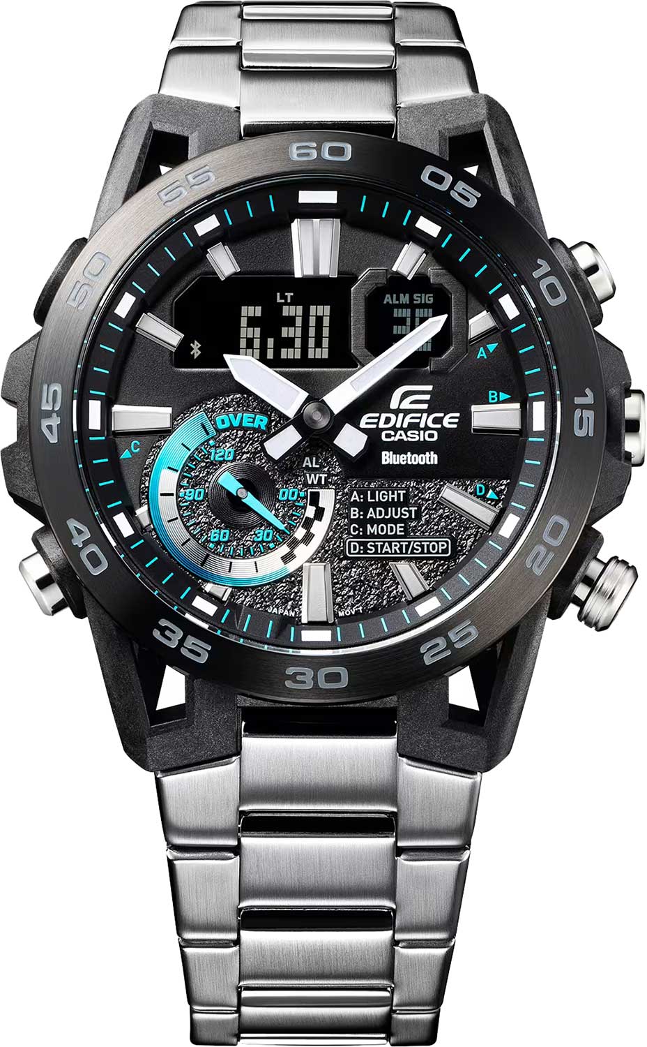 Стильная и функциональная новинка в линейке Edifice пронизана насквозь спортом и духом скорости. Edifice Sospensione. Мужские часы, дизайн которых вдохновлен подвеской болида Формулы-1. Ушки часов разработаны по схеме четырехрычажной подвески гоночного автомобиля. Двойная подcветка: циферблат и ЖК-дисплеи подсвечиваются светодиодом, благодаря наличию функции задержки, после отпускания кнопки освещение горит еще несколько секунд. При повороте часов в сторону лица, подсветка включается автоматически. Настраиваемое послесвечение 1,5 или 3сек. Цвет подсветки: белый. Необритовое светонакопительное покрытие обеспечивает длительное послесвечение в темноте даже после кратковременного нахождения на свету. 12-ти и 24-х часовой формат времени. Секундомер с двумя точностями показаний: 1/1000с (до 1ч) и 1/10с (после 1ч) и временем измерения 24ч. SPLIT-хронограф. Память на 200 кругов. Таймер обратного отсчета от 1с до 24ч. Мировое время – 38 городов (38 часовых поясов), всемирное координированное время (UTC). Автоматический переход на зимнее и летнее время, возможность включения/отключения данной функции. Переключение между домашним и мировым временем. Беспроводная технология Bluetooth® со сверхнизким потреблением энергии для синхронизации со смартфоном. При подключении к смартфону часы корректируют текущее время, позволяют настроить будильник или таймер, а также копируют настройки мирового времени (до 300 городов). Авиарежим. Отображение дней недели на шести языках. Смена отображения даты/месяца. Функции перемещения стрелок, поиска телефона и включения/отключения звука. Включение/выключение звукового сигнала по расписанию. Батарейка рассчитана на 2 года. Стальная задняя крышка крепится на 4-х винтах. Браслет с тройной раскладывающейся застежкой, расстегиваемой одним касанием.