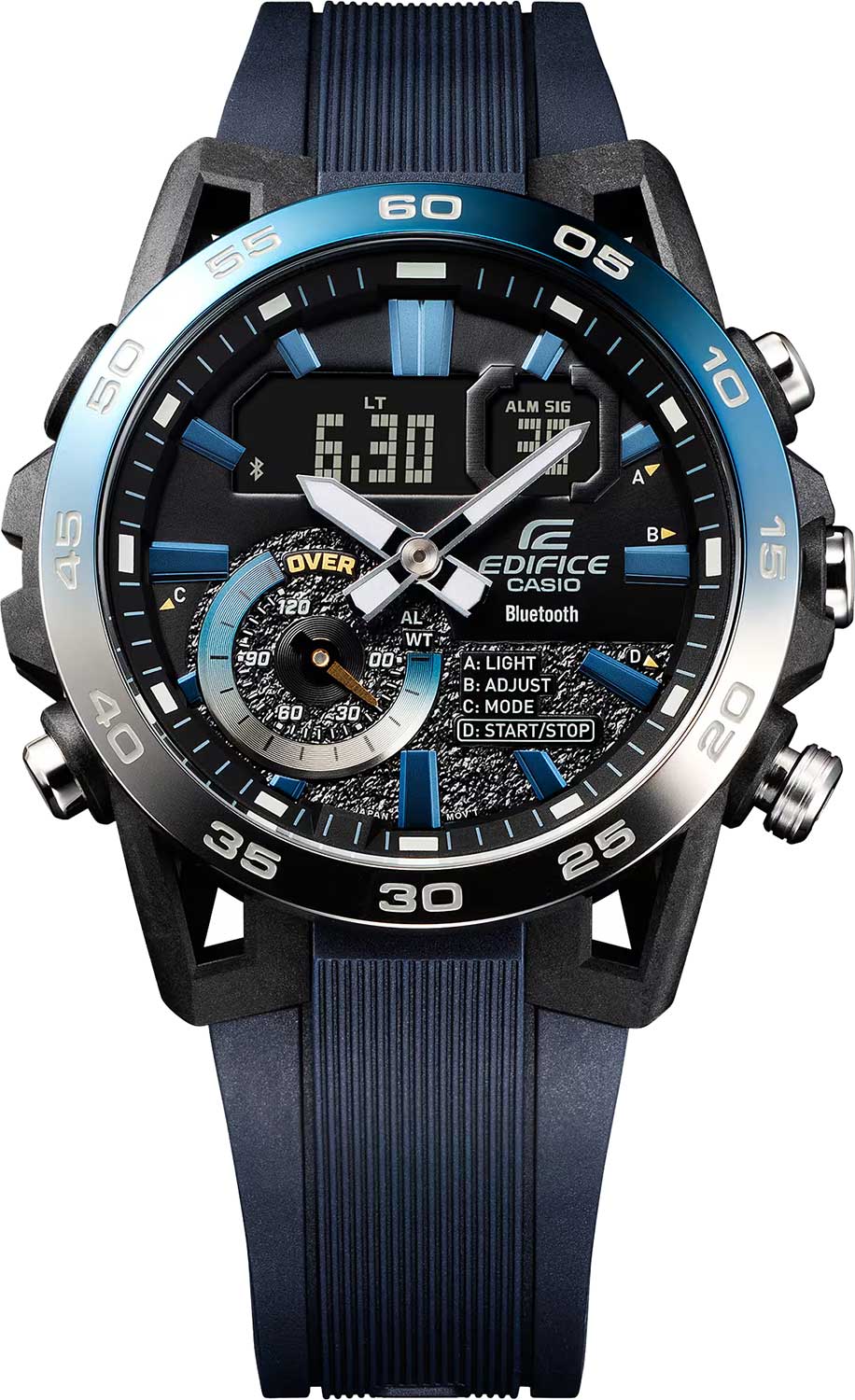 Стильная и функциональная новинка в линейке Edifice пронизана насквозь спортом и духом скорости. Edifice Sospensione Nighttime Drive. Мужские часы, дизайн которых вдохновлен подвеской болида Формулы-1. Ушки часов разработаны по схеме четырехрычажной подвески гоночного автомобиля. Цветовая гамма вдохновлена сиянием фар и уличных фонарей, которая прорезает синеву ночного неба. Двойная подcветка: циферблат и ЖК-дисплеи подсвечиваются светодиодом, благодаря наличию функции задержки, после отпускания кнопки освещение горит еще несколько секунд. При повороте часов в сторону лица, подсветка включается автоматически. Настраиваемое послесвечение 1,5 или 3сек. Цвет подсветки: белый. Необритовое светонакопительное покрытие обеспечивает длительное послесвечение в темноте даже после кратковременного нахождения на свету. 12-ти и 24-х часовой формат времени. Секундомер с двумя точностями показаний: 1/1000с (до 1ч) и 1/10с (после 1ч) и временем измерения 24ч. SPLIT-хронограф. Память на 200 кругов. Таймер обратного отсчета от 1с до 24ч. Мировое время – 38 городов (38 часовых поясов), всемирное координированное время (UTC). Автоматический переход на зимнее и летнее время, возможность включения/отключения данной функции. Переключение между домашним и мировым временем. Беспроводная технология Bluetooth® со сверхнизким потреблением энергии для синхронизации со смартфоном. При подключении к смартфону часы корректируют текущее время, позволяют настроить будильник или таймер, а также копируют настройки мирового времени (до 300 городов). Авиарежим. Отображение дней недели на шести языках. Смена отображения даты/месяца. Функции перемещения стрелок, поиска телефона и включения/отключения звука. Включение/выключение звукового сигнала по расписанию. Батарейка рассчитана на 2 года. Стальная задняя крышка крепится на 4-х винтах. Браслет с тройной раскладывающейся застежкой, расстегиваемой одним касанием.