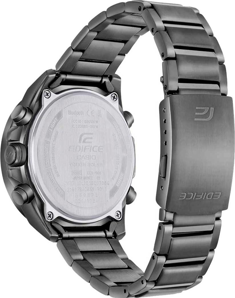 Новинка в серии Edifice ECB не останется не замеченной у любителей надежных и многофункциональных часов. Edifice. Мужские часы. Питание от солнечной энергии Tough Solar - высокоэффективная солнечная батарея, аккумулятор, индикатор низкого заряда батареи. Функция автоматического сохранения энергии. Время работы аккумулятора без подзарядки приблизительно 6 месяцев, при включенной функции сохранения энергии приблизительно 19 месяцев. Двойная подсветка Super Illuminator с функцией Afterglow (для подсветки не нужно удерживать кнопку, время послесвечения настраивается 1,5 или 3 сек): одновременно подсвечивается аналоговый циферблат и цифровой дисплей. Цвет подсветки: белый. 12-ти и 24-х часовой формат времени. Часы-хронограф с секундомером и тахиметром. Секундомер с разрешениями показаний: 1/1000 сек (до 1 ч) и 1/10 сек (после 1 ч) и временем измерения 24 ч. SPLIT-хронограф. Таймер обратного отсчета от 1 сек до 24 ч. Мировое время – 39 городов (39 часовых поясов). Автоматический переход на зимнее и летнее время, возможность включения/отключения данной функции. Переключение между домашним и мировым временем. Беспроводная технология Bluetooth® со сверхнизким потреблением энергии для синхронизации со смартфоном. При подключении к смартфону часы автоматически корректируют текущее время, в том числе переход на зимнее/летнее время, копируют настройки мирового времени более чем для 300 городов. Приложение EDIFICE Connected позволяет вести журнал показаний секундомера и прохождения этапов, вычислять разность между заданным временем и временем этапа. Память на 200 этапов. Измерение скорости отображается на ретроградном циферблате в положении 4 часа. Функция перемещения стрелок для беспрепятственного просмотра информации на цифровых дисплеях, включения/отключения звука и поиска телефона. Заводная головка с защитой. Задняя крышка крепится на 4-х винтах. Браслет с тройной раскладывающейся застежкой, расстегиваемой одним касанием. Предохранительная защелка на браслете препятствует случайному расстегиванию.