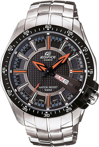 Edifice. Завинчивающаяся заводная головка. Задняя крышка с винтовым фиксатором. Раскладывающаяся застежка, расстегиваемая одним касанием.