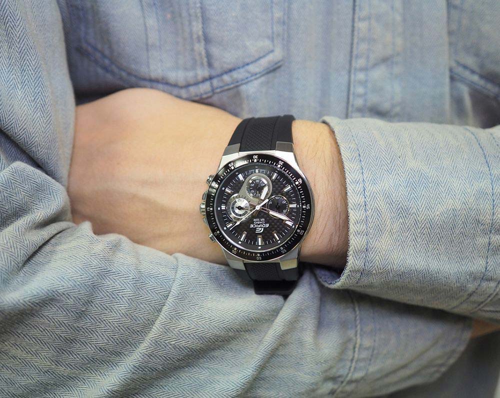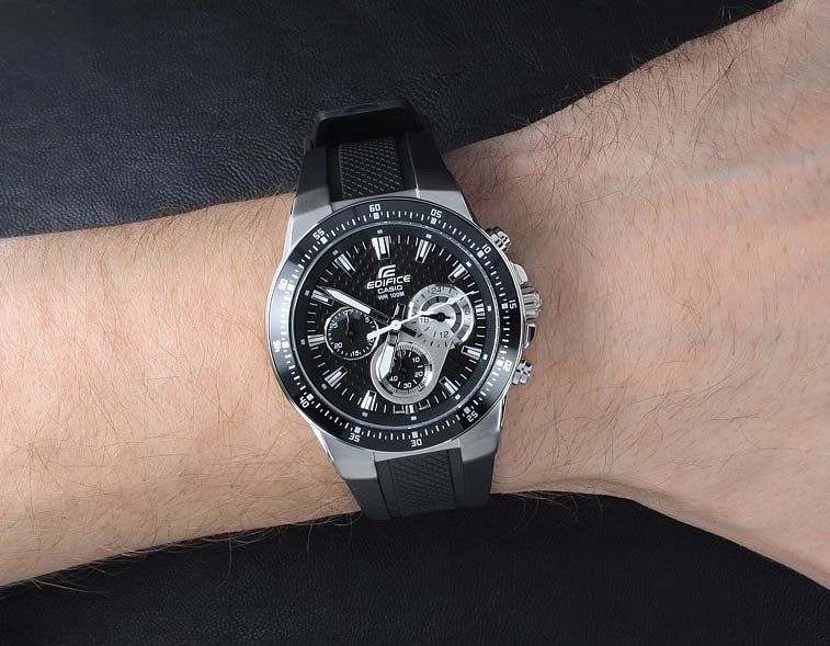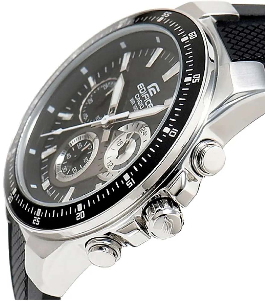 Часы в гоночном стиле - отличный выбор для покорителей трасс. Edifice. Часы-хронограф с секундомером точностью 1 сек и временем измерения 30мин. Задняя крышка с винтовым фиксатором.