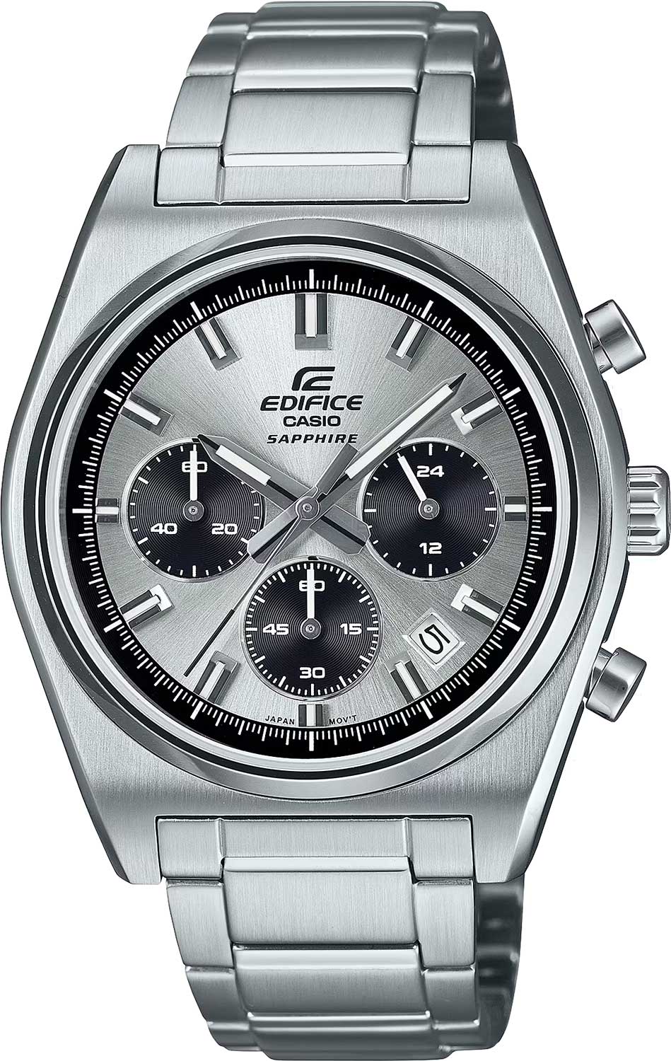 Хронограф Edifice - эталон идеальных повседневных мужских часов. Edifice. Часы-хронограф с секундомером с точностью показаний 1с и временем измерения 1ч. 12-ти и 24-х часовой формат времени. Циферблат с метками в виде штрихов выполнен по технологии Sunray (солнечные лучи) и защищен прочным сапфировым стеклом. Окошко даты находится между метками 4 и 5 часов. Задняя крышка с винтовым фиксатором. Батарейка рассчитана на 3 года. Браслет с тройной раскладывающейся застежкой, расстегиваемой одним касанием.