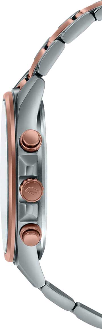 Новинка в коллекции Edifice в тонком корпусе обратит на себя внимания стильных поклонников спорта. Edifice. Ультратонкий хронограф заключен в корпус толщиной всего 9,1мм. Часы-хронограф с секундомером точностью с точностью 1/1с и временем измерения 30мин. Метки в виде штрихов. Окошко даты находится в положении 4 часа. Заводная головка с защитой. Батарея рассчитана на 5 лет. Тройная раскладывающаяся застежка, расстегиваемая одним касанием.