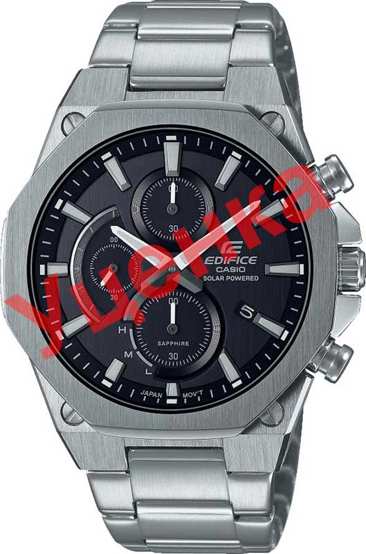 Edifice. Новинка в коллекции часов Edifice. Ультратонкие. Питание от солнечной энергии, индикатор уровня зарядки батареи. Необритовое светонакопительное покрытие обеспечивает длительное послесвечение в темноте даже после кратковременного нахождения на свету. Часы-хронограф с секундомером с временем измерения 60мин. Секундная стрелка вынесена на отдельный циферблат. Метки в виде штрихов. Окошко даты находится в положении 4 часа. Восьмиугольный безель. Заводная головка с защитой. Водонепроницаемость в соответствии с ISO 2281. Тройная раскладывающаяся застежка, расстегиваемая одним касанием. Застежка с системой блокировки.
