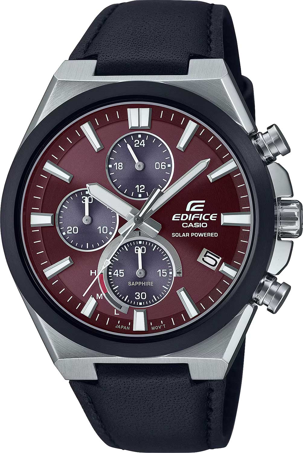 Хронограф Casio Edifice без сомнения создаст идеальный спортивный образ для любого мужчины. Edifice. Питание от солнечной энергии, индикатор уровня зарядки батареи. Время работы аккумулятора без подзарядки приблизительно 5 месяцев. Необритовое светонакопительное покрытие обеспечивает длительное послесвечение в темноте даже после кратковременного нахождения на свету. Часы-хронограф с секундомером с точностью показаний 1с и временем измерения 30мин. 12-ти и 24-х часовой формат времени. Циферблат с метками в виде штрихов. Окошко даты находится в положении 4 часа. Заводная головка с защитой. Задняя крышка с винтовым фиксатором. Ремешок с классической застежкой.
