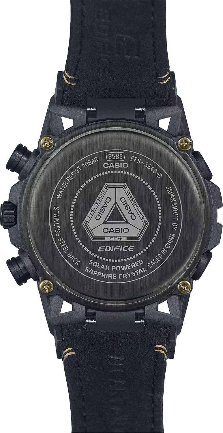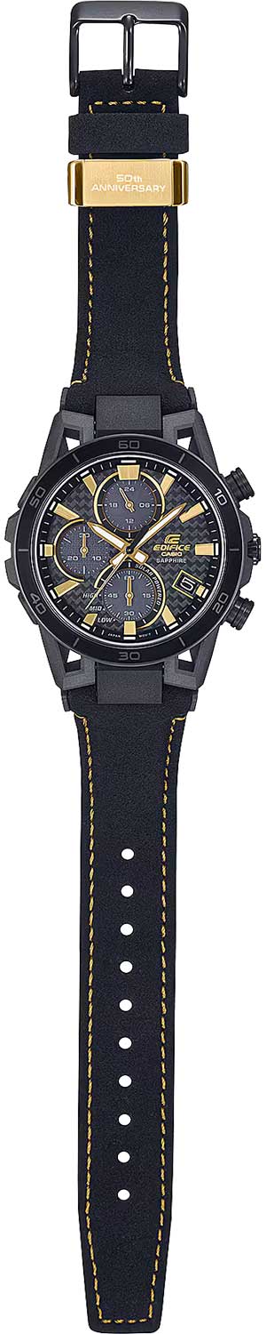 Пронизанная духом скорости эта новинка в серии часов Edifice подтолкнет вас на покорение новых вершин. Edifice Sospensione 50th Anniversary. Лимитированная серия. Модель создана в честь 50-летия часов Casio. Дизайн вдохновлен подвеской болида Формулы-1. Ушки часов разработаны по схеме четырехрычажной подвески гоночного автомобиля. Питание от солнечной энергии, индикатор уровня зарядки батареи. Время работы аккумулятора без подзарядки приблизительно 5 месяцев. Часы-хронограф с секундомером с точностью показаний 1с и временем измерения 30мин. 12-ти и 24-х часовой формат времени. Карбоновый циферблат с метками в виде штрихов защищен прочным сапфировым стеклом. Окошко даты находится в положении 4 часа. Заводная головка с защитой. Стальная задняя крышка крепится на 4-х винтах. Ремешок из алькантары с классической застежкой.