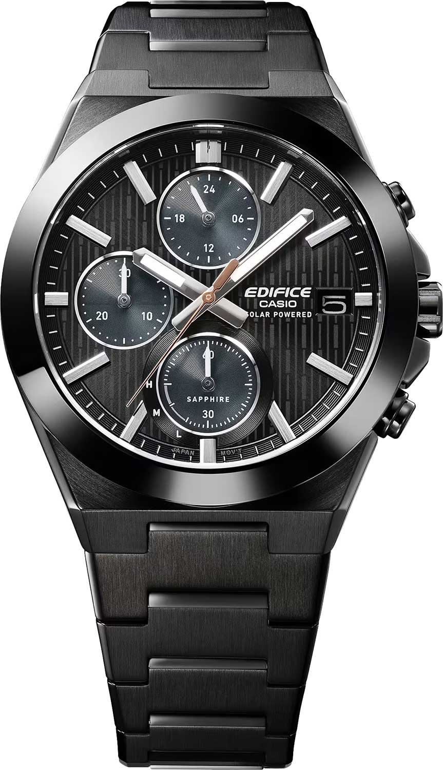 Edifice. Питание от солнечной энергии, индикатор заряда батареи. Время работы аккумулятора без подзарядки приблизительно 5 месяцев.