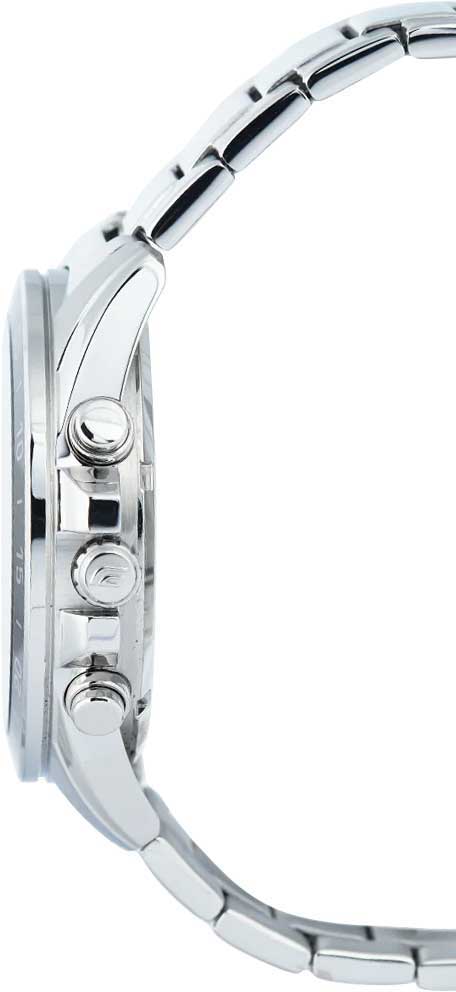 Edifice. Часы-хронограф с секундомером. Секундомер с точностью показаний 1/10с и временем измерения 1ч. Циферблат с метками в виде штрихов. Окошко даты находится в положении 4 часа.