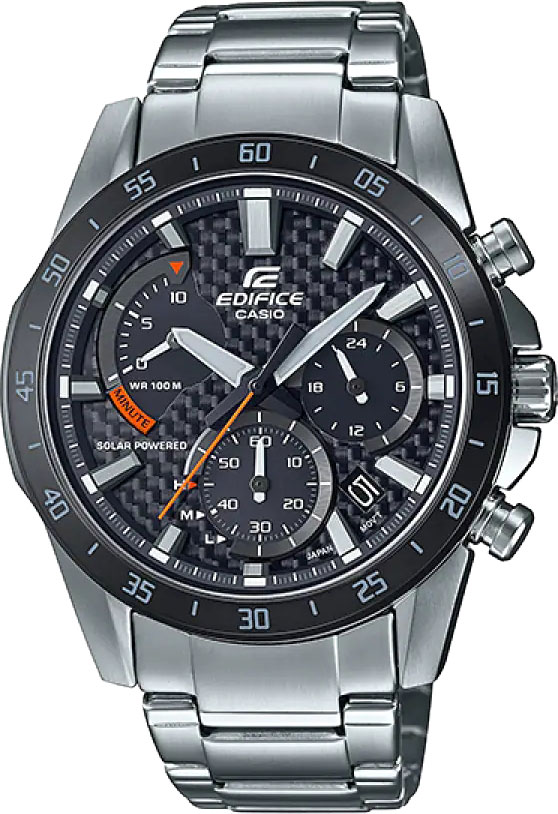 Инновационный спортивный хронограф с солнечной батареей и циферблатом из углеродного волокна. Эти часы с привлекающей внимание секундной стрелкой - ответ на просьбу гоночных команд, которым важна каждая секунда. Инновационная технология обеспечивает солнечную энергию даже при использовании непрозрачного карбона, из которого изготовлен циферблат. Оригинальные солнечные батареи Casio получают достаточно света для питания часов через три маленьких вставных циферблата. Edifice Solar Powered Chronograph. Питание от солнечной энергии, индикатор низкого заряда батареи. Время работы аккумулятора без подзарядки до 5 месяцев. Светонакопительное покрытие Neobrite обеспечивает длительное послесвечение в темноте даже после кратковременного нахождения на свету. Секундомер с разрешением показаний 1 сек и временем измерения 10 мин. Заводная головка с защитой. Завинчивающаяся задняя крышка.