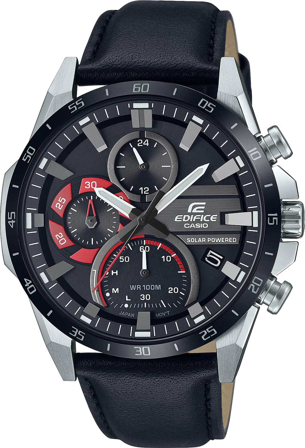 Часы вдохновленные скоростью и гоночными автомобилями - выбор активных и динамичных мужчин. Edifice. Питание от солнечной энергии, индикатор уровня зарядки батареи. Время работы аккумулятора без подзарядки приблизительно 5 месяцев. Часы-хронограф с секундомером с точностью показаний 1с и временем измерения 30мин. 12-ти и 24-х часовой формат времени. Циферблат с метками в виде штрихов выполнен по технологии Sunray (солнечные лучи). Окошко даты находится в положении 4 часа. Заводная головка с защитой. Задняя крышка с винтовым фиксатором. Ремешок с классической застежкой.