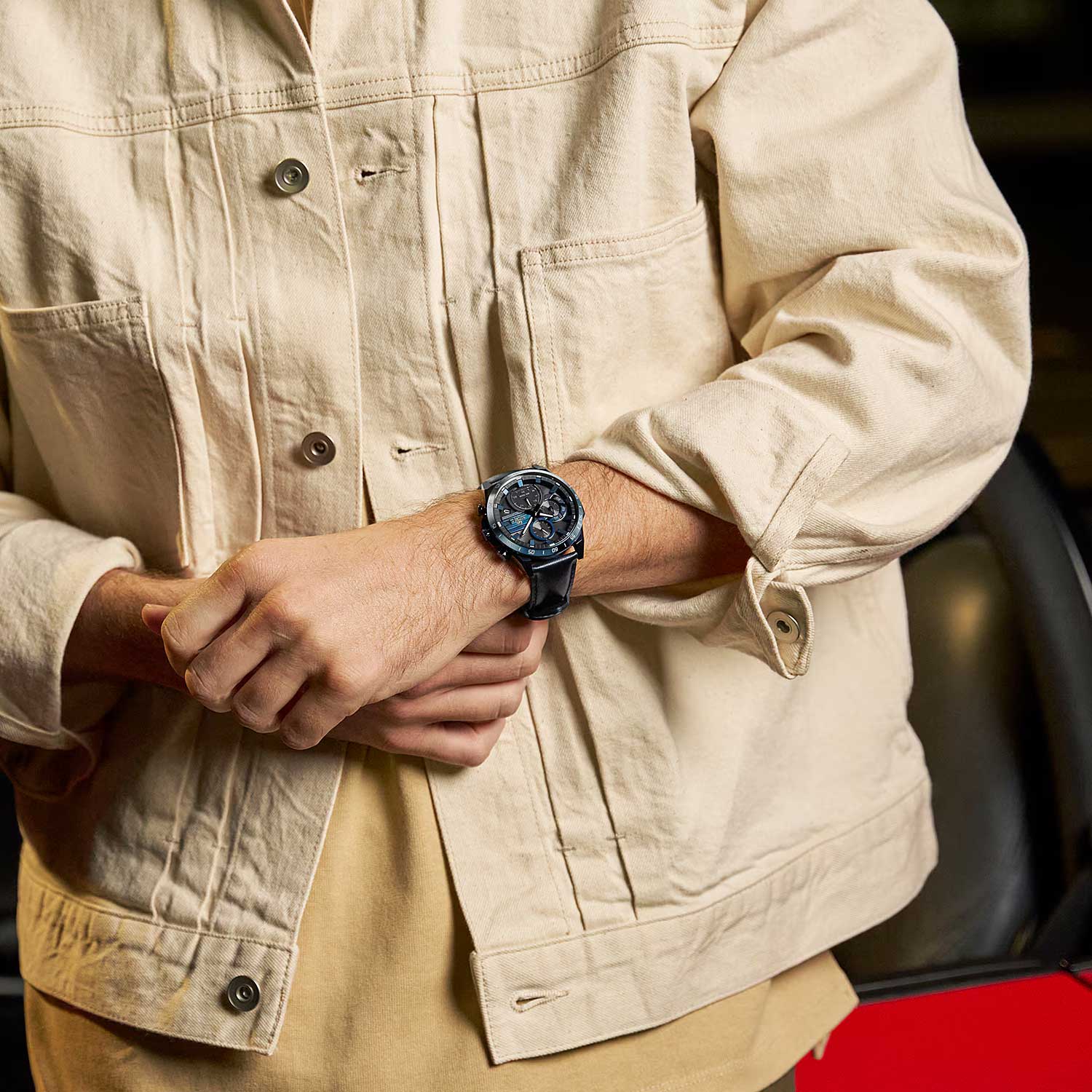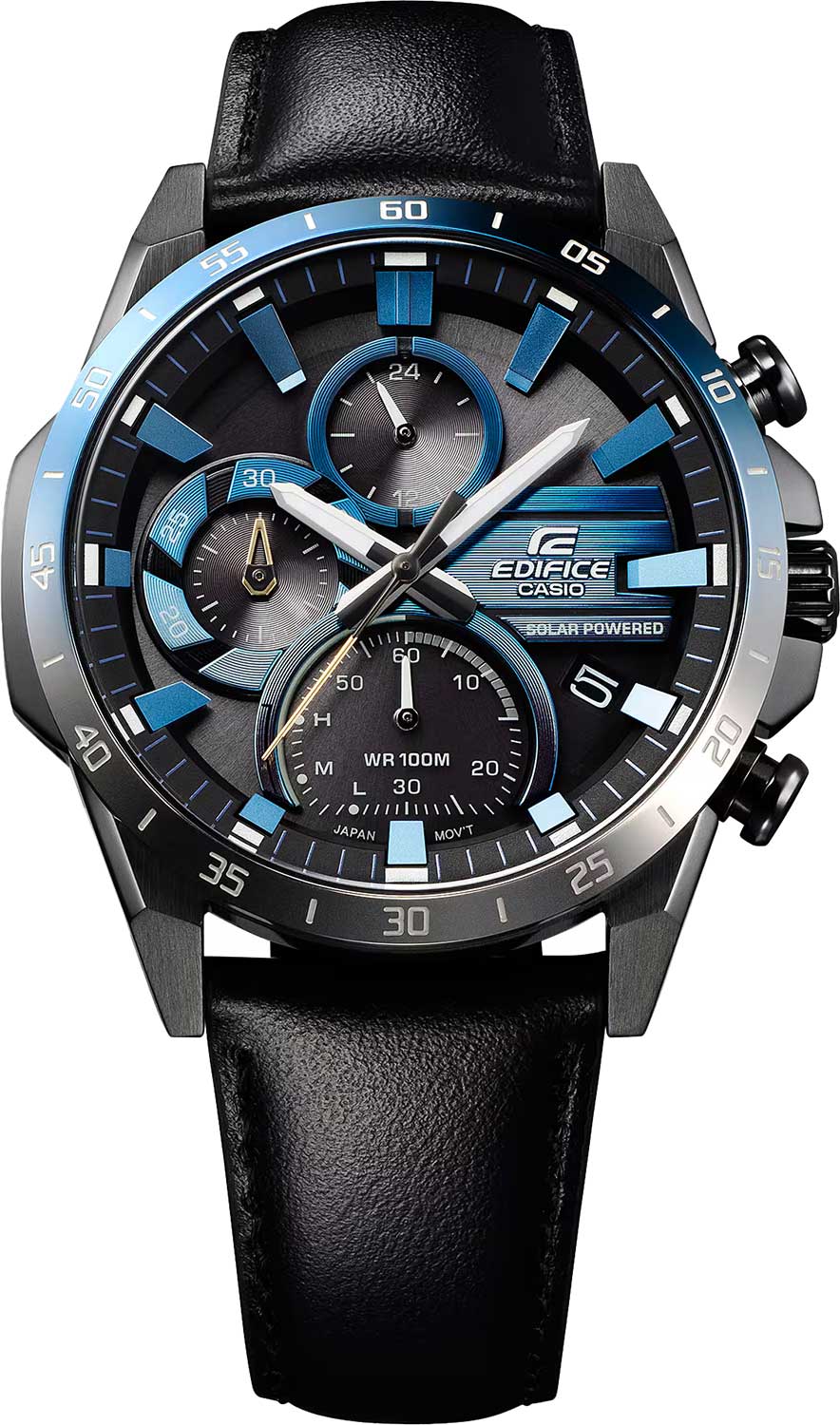 Часы вдохновленные скоростью и гоночными автомобилями - выбор активных и динамичных мужчин. Edifice Nighttime Drive. Цветовая гамма вдохновлена сиянием фар и уличных фонарей, которая прорезает синеву ночного неба. Питание от солнечной энергии, индикатор уровня зарядки батареи. Время работы аккумулятора без подзарядки приблизительно 5 месяцев. Часы-хронограф с секундомером с точностью показаний 1с и временем измерения 30мин. 12-ти и 24-х часовой формат времени. Циферблат с метками в виде штрихов выполнен по технологии Sunray (солнечные лучи). Окошко даты находится в положении 4 часа. Заводная головка с защитой. Задняя крышка с винтовым фиксатором. Ремешок с классической застежкой.