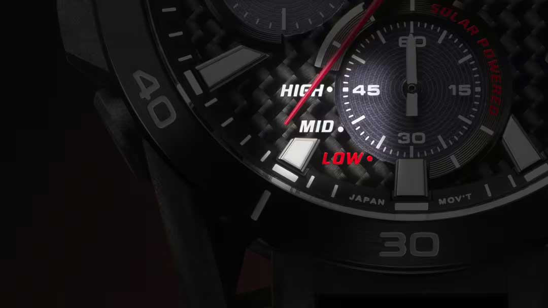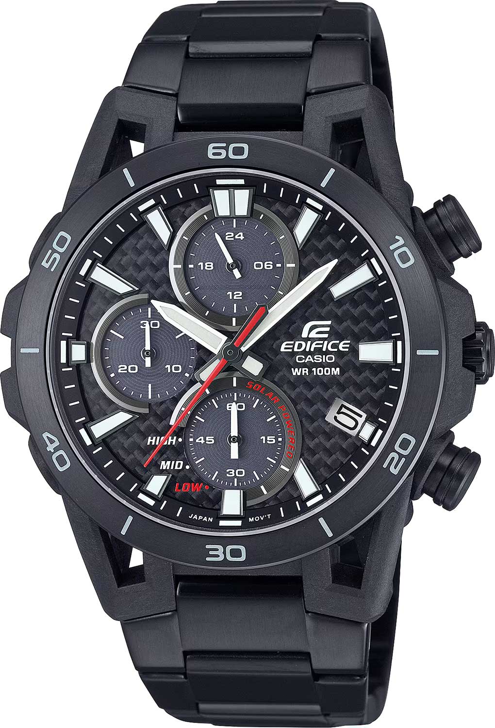 Часы из коллекции Edifice выбирают смелые и активные мужчины, которые не останавливаются на достигнутом! Edifice Sospensione. Мужские часы, дизайн которых вдохновлен подвеской болида Формулы-1. Ушки часов разработаны по схеме четырехрычажной подвески гоночного автомобиля. Питание от солнечной энергии, индикатор уровня зарядки батареи. Время работы аккумулятора без подзарядки приблизительно 5 месяцев. Часы-хронограф с секундомером с точностью показаний 1с и временем измерения 30мин. 12-ти и 24-х часовой формат времени. Карбоновый циферблат с метками в виде штрихов. Окошко даты находится в положении 4 часа. Заводная головка с защитой. Задняя крышка крепится на 4-х винтах. Браслет с тройной раскладывающейся застежкой, расстегиваемой одним касанием.