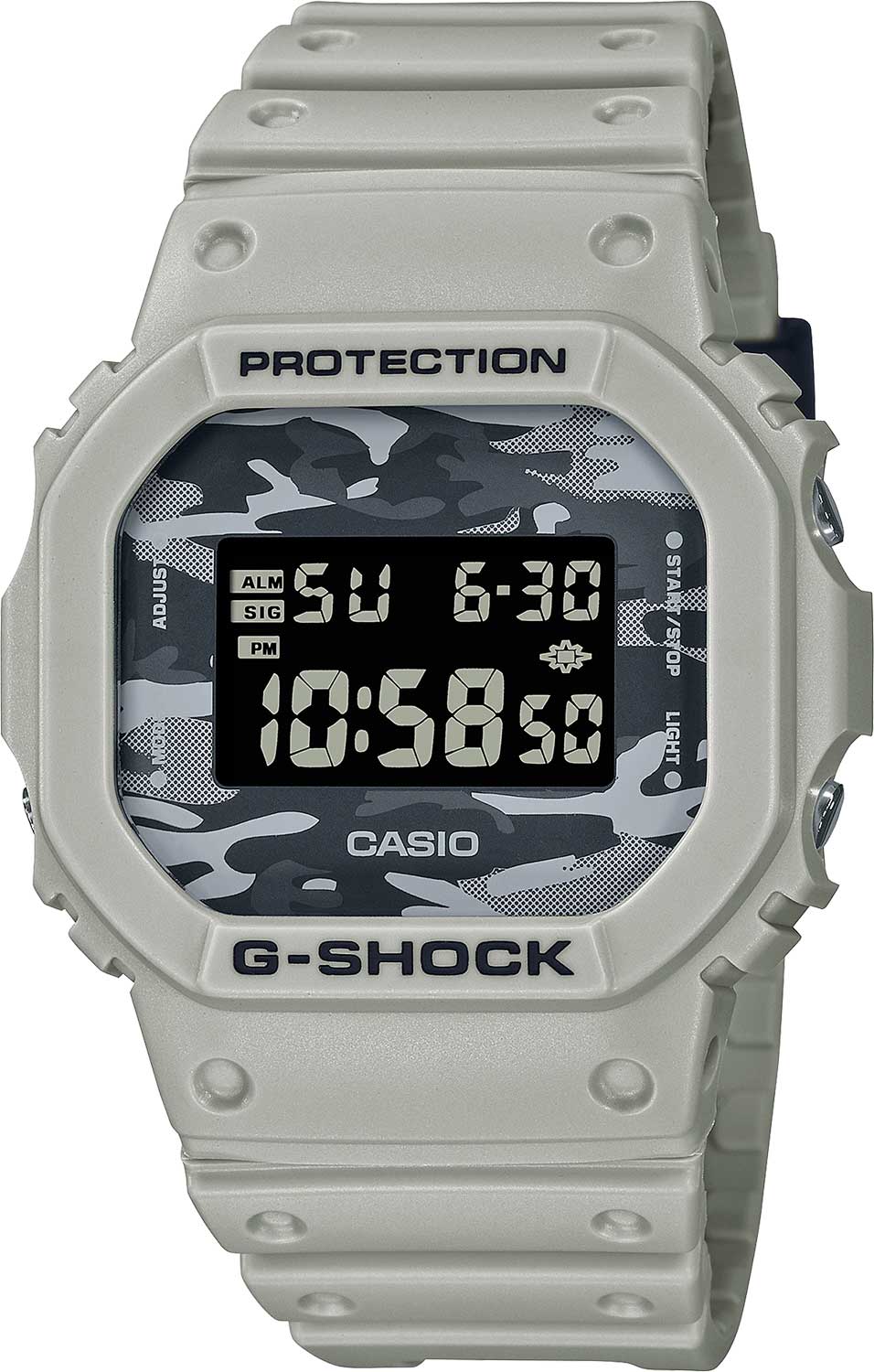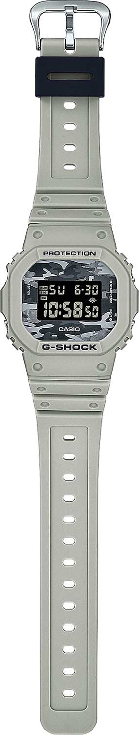 Стильный часы от Casio идеально подходят для тех, кто предпочитает спортивный стиль, но при этом остается в тренде. G-Shock Camo Utility. Новая модель часов создана на базе DW-5600. Противоударный корпус защищает механизм от ударов и вибрации. Электролюминесцентная подсветка освещает весь циферблат, после отпускания кнопки свечение продолжается еще некоторое время. Световая индикация сигнала. Цвет подсветки: сине-зеленый. 12-ти и 24-х часовой формат времени. Секундомер с двумя точностями показаний: 1/100с (до 1ч) и 1с (после 1ч) и временем измерения 24ч. SPLIT-хронограф. Таймер обратного отсчета от 1с до 24ч с автоповтором. Будильник с автоповтором. Типы сигналов: ежедневный, ежемесячный, каждый день определенного месяца, на определенную дату. Батарейка рассчитана на 2 года. Водонепроницаемость в соответствии с ISO 22810. Ремешок из полимерного материала с классической застежкой.