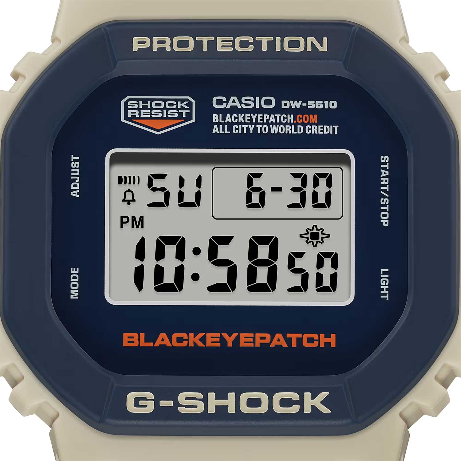 Мужские наручные часы G-Shock x BlackEyePatch. Модель создана совместно с японским брендом модной одежды BlackEyePatch. Корпус и ремешок выполнены из биопластика, который изготавливается из возобновляемых органических ресурсов. Противоударный корпус защищает механизм от ударов и вибрации.
